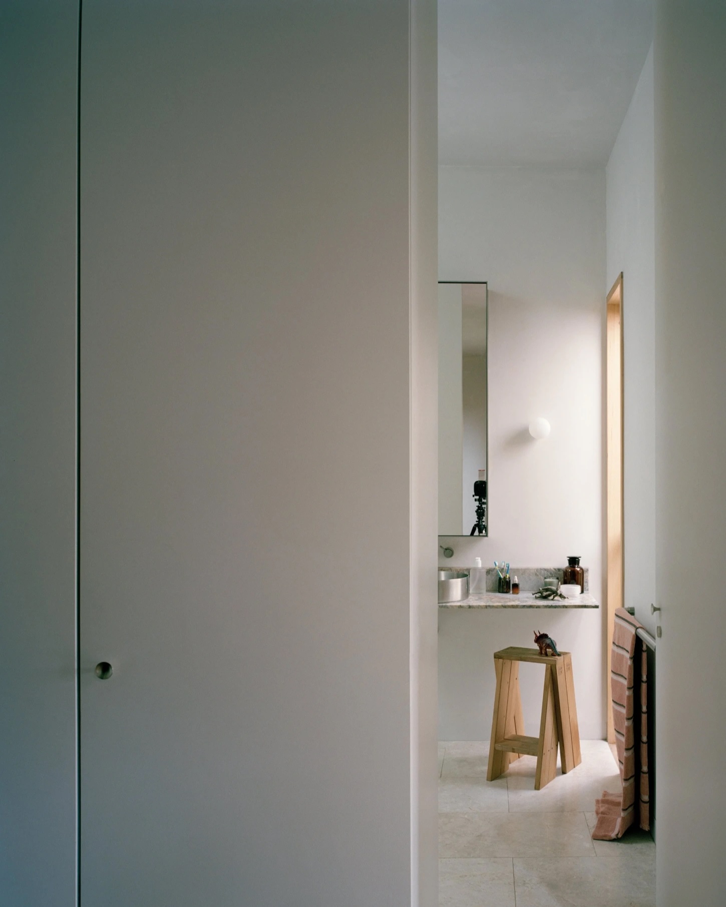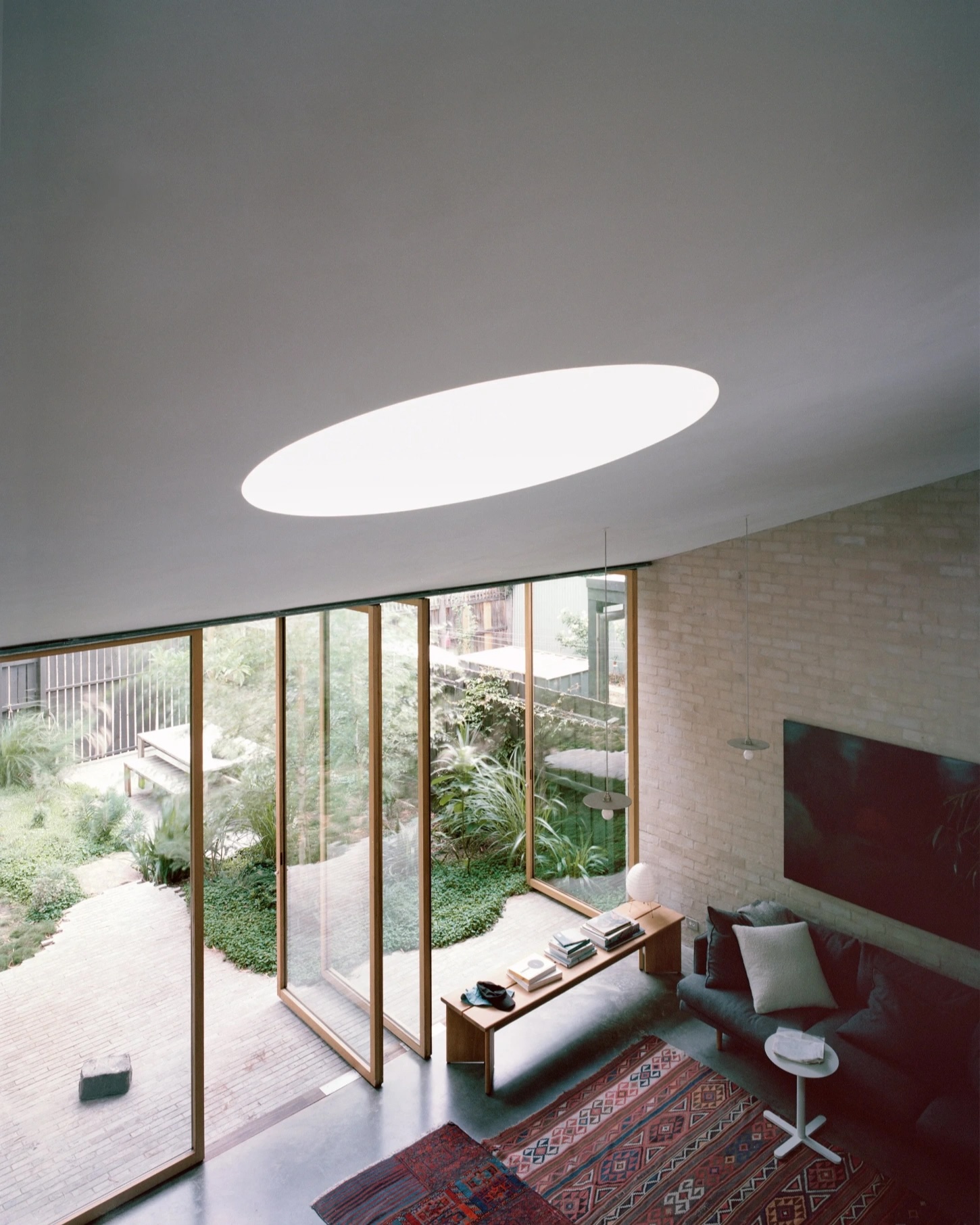 Lumière et mouvement définissent les intérieurs. Les enfants roulent à vélo sur le sol en béton bruni ; l’îlot central en noyer de quatre mètres de haut se transforme en espace de travail, table à manger et bureau. Un oculus dans le mur supérieur encadre l’eucalyptus d’un voisin. Des balustrades en treillis métallique apportent transparence et délicatesse.