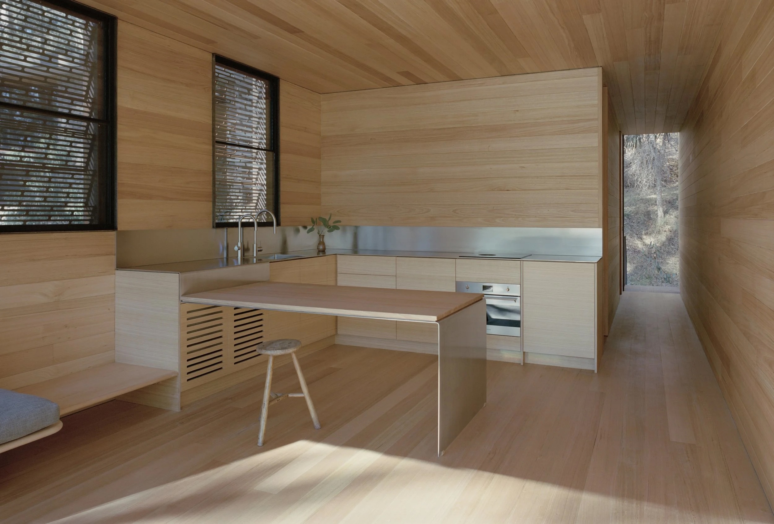 La décoration intérieure est également épurée ; entièrement réalisée en frêne local, elle crée une ambiance chaleureuse et apaisante. Les grandes baies vitrées permettent une connexion directe avec l’extérieur, offrant une vue imprenable sur la canopée des arbres et permettant d’observer les oiseaux, les wombats et les kangourous qui fréquentent régulièrement les lieux.