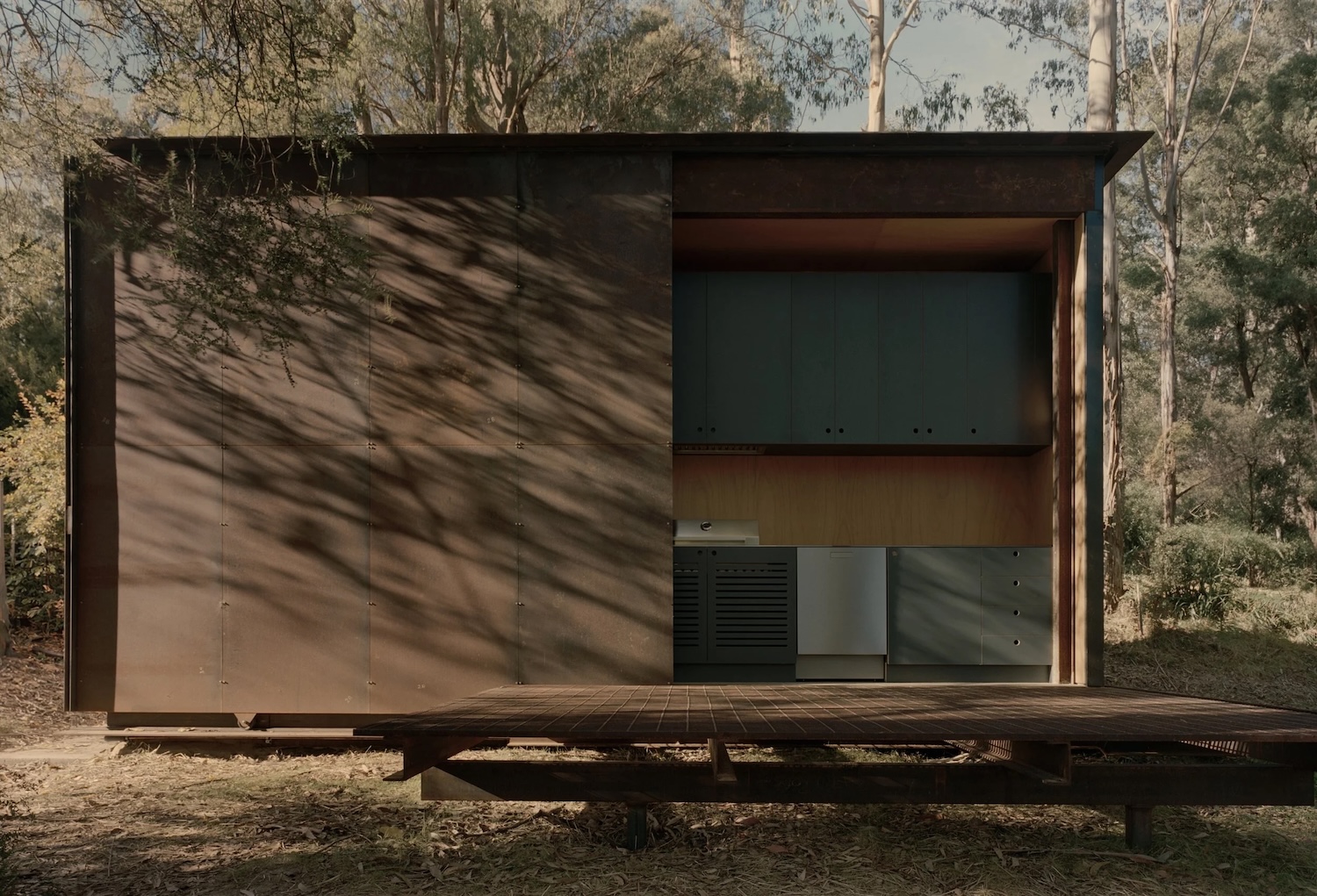Conçu comme un lieu de villégiature pour la cliente – qui avait passé plusieurs années à camper sur le terrain – à partager avec sa famille et ses amis, et à louer pour des séjours de courte durée, le projet est volontairement compact, avec une seule chambre, une salle de bain, une cuisine et un salon (une cuisine extérieure et une buanderie sont situées dans un bâtiment séparé).