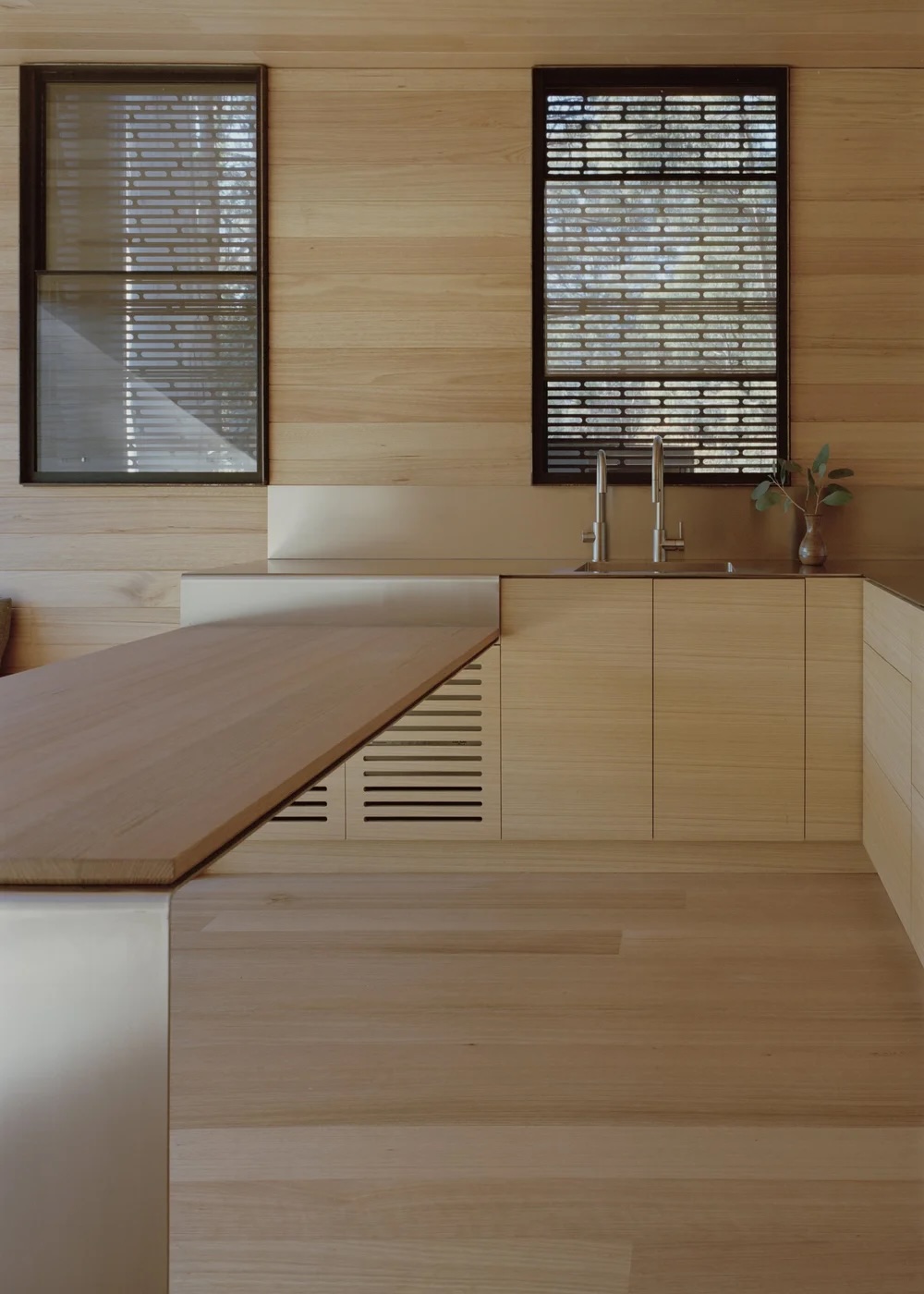 Les plans de travail et les meubles en acier inoxydable, conçus par Walker, apportent une touche de modernité à la palette de couleurs naturelles, tandis que la vue sur la verdure environnante dynamise l’espace.