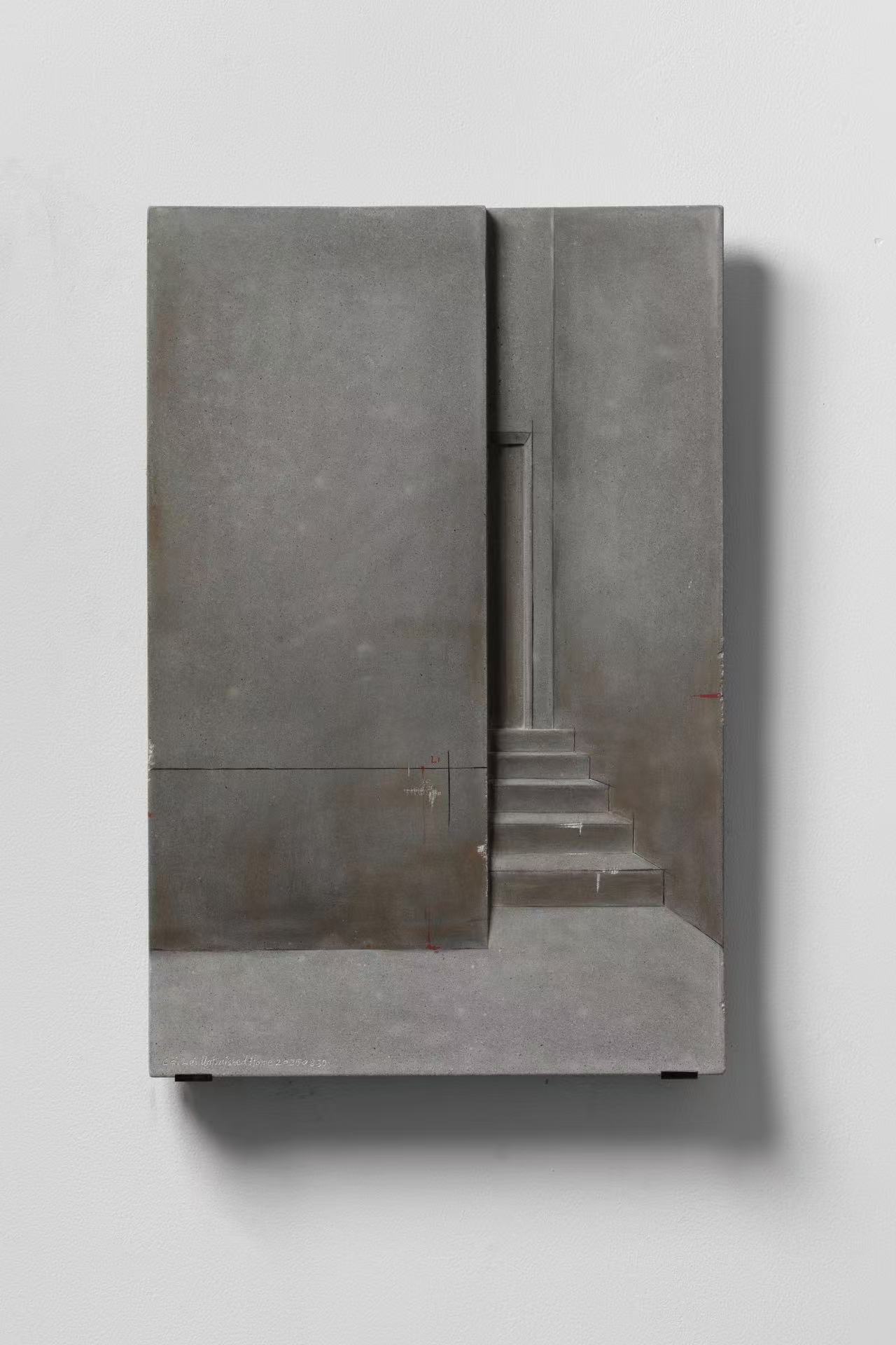 Travaillant sur des supports tels que les peintures au ciment, les peintures acryliques et les sculptures en bronze, Cai Lei sonde les frontières entre le réel et l’imaginaire, le solide et l’éphémère. Chaque matériau a un poids conceptuel distinct dans son oeuvre, tout en restant unifié par une préoccupation centrale : la transformation-manipulation de l’espace et la consistance-évanescence de la mémoire.