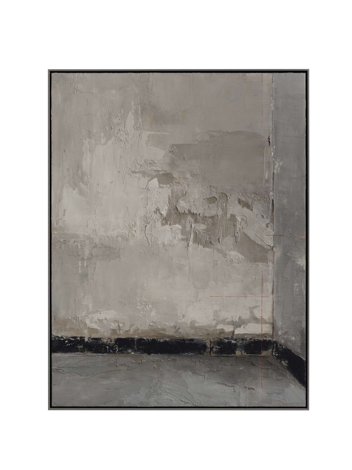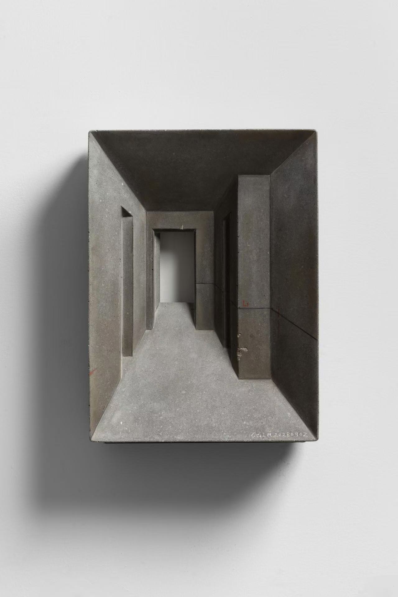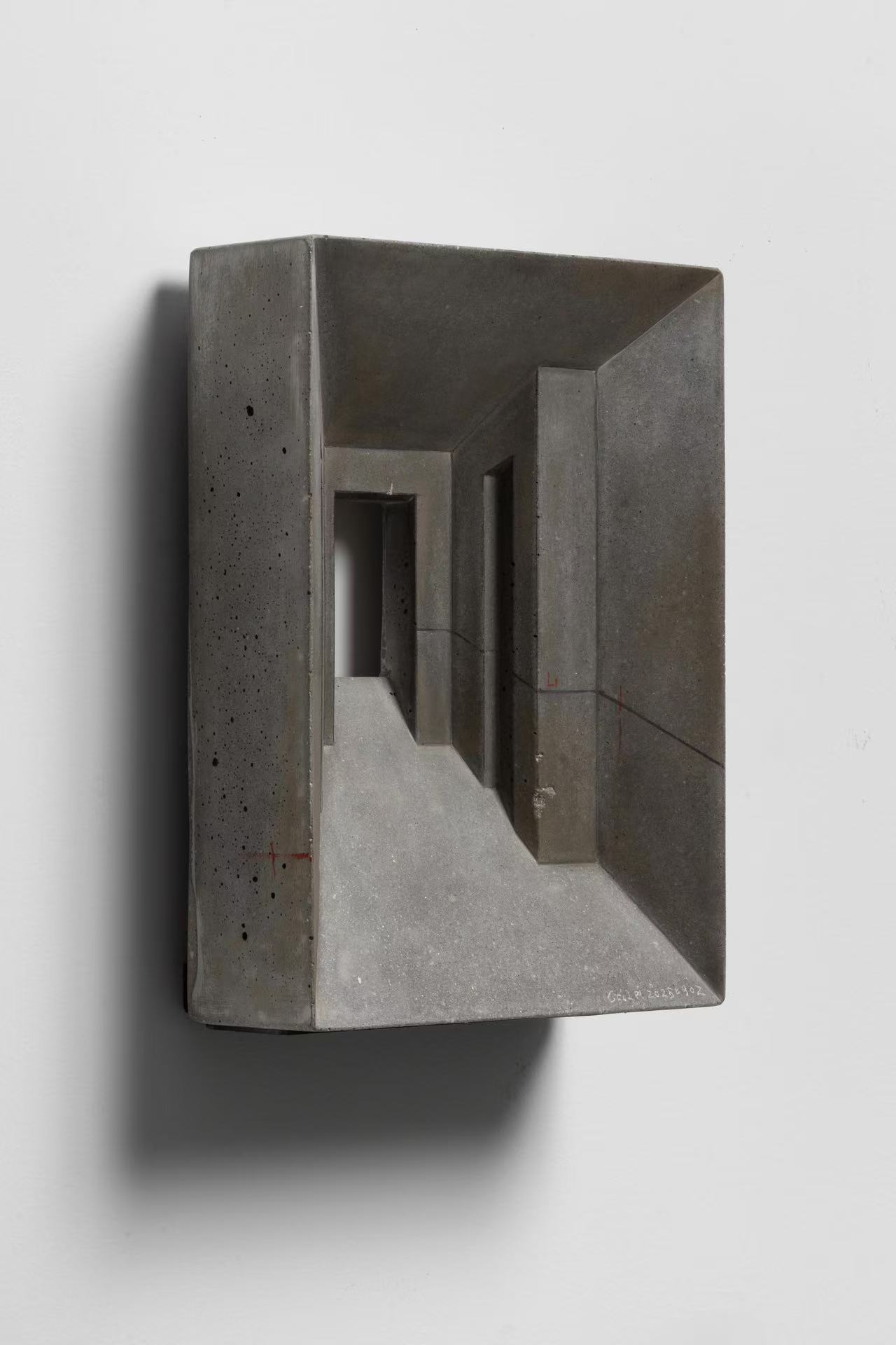En ciment, acrylique, bronze ou acier, il compose des espaces architecturaux fictifs – couloirs, recoins, pans de murs – qui semblent tantôt s’étirer, tantôt se dérober au regard du spectateur. Il en résulte des oeuvres à la fois minimalistes, conceptuelles et sensibles, traversées par des interrogations sur la perception, la mémoire et le déplacement, aussi bien spatial que mental.