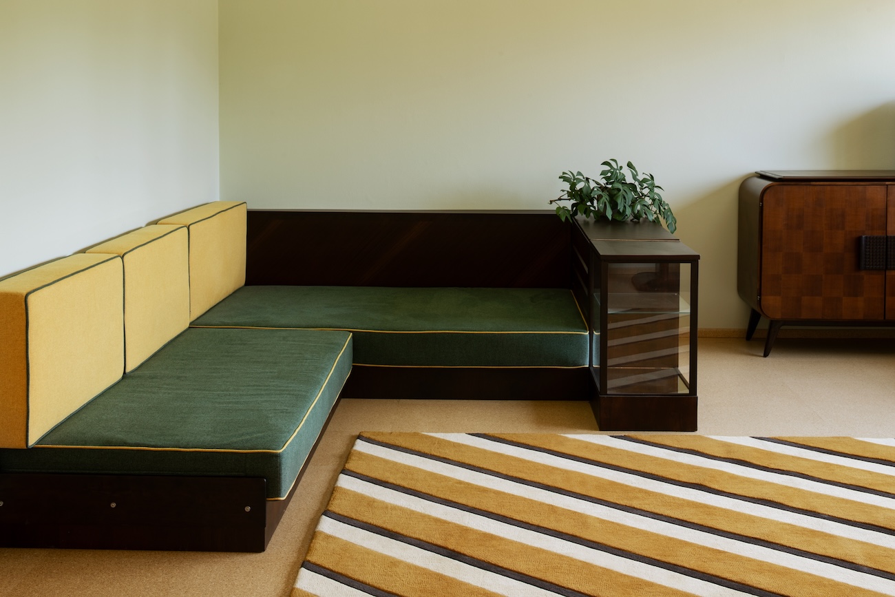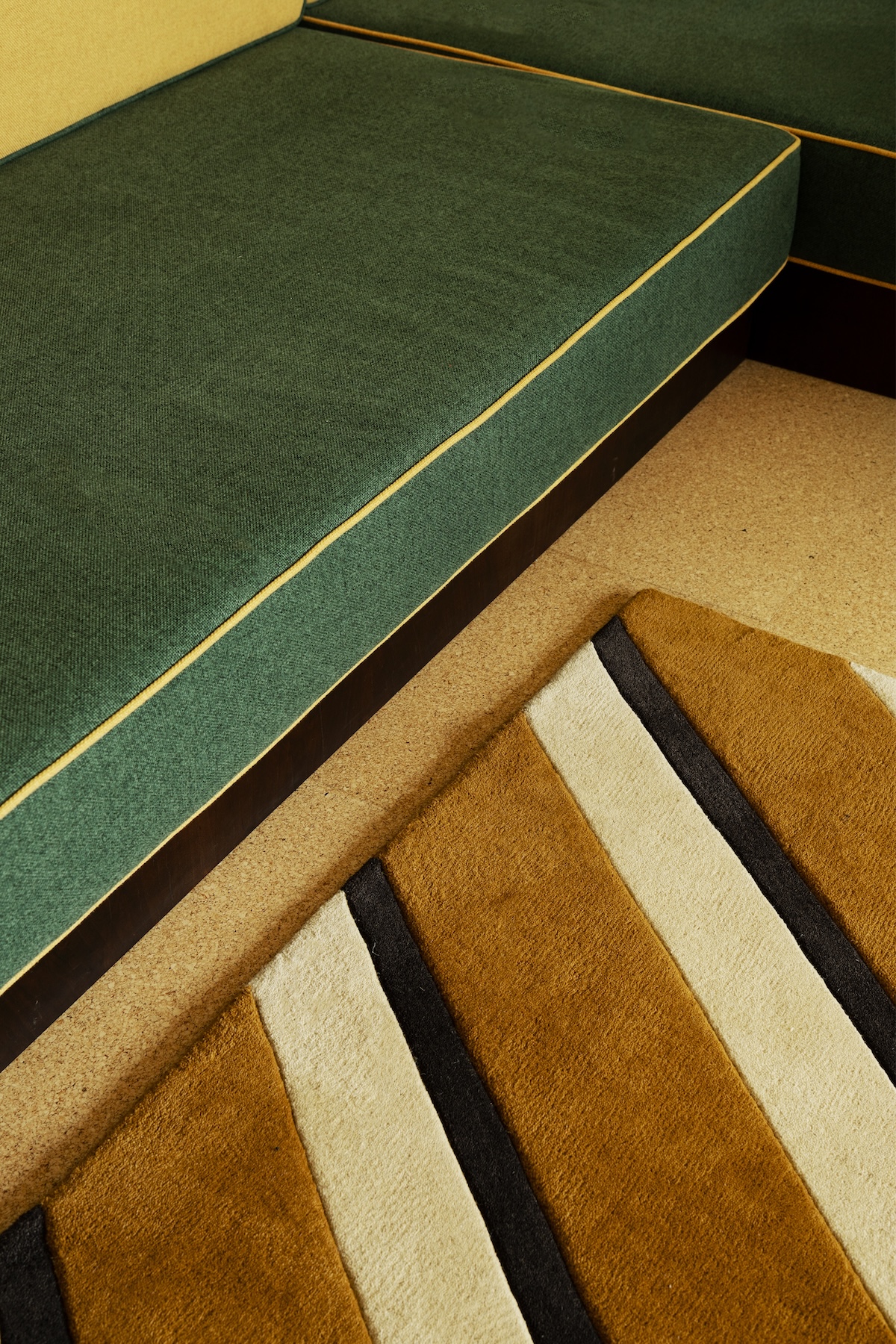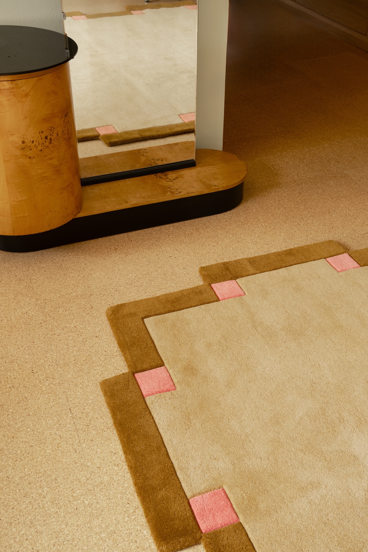 Fregio part de l’idée d’une frise de sol — une bordure décorative mais fonctionnelle qui délimite une pièce sans la remplir. Une version explore la combinaison de vert olive profond, de tons blush et de bordeaux pour une esthétique à la résonance internationale. La seconde est plus personnelle : un duo rose et jaune, inspiré des tenues iconiques de Fifi Brindacier (Pippi Långstrump) et Annika.