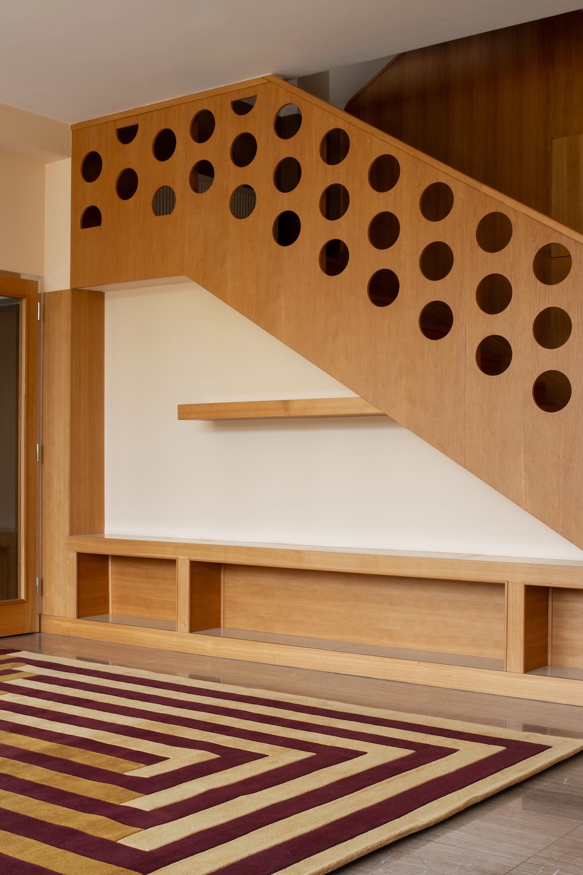 Labyrinth s’inspire des installations spatiales de Tekla, où les surfaces sont souvent organisées en séquences et transitions. Ce tapis se présente comme une structure graphique aux qualités tridimensionnelles, faisant subtilement référence à l’architecture de Carlo Scarpa — en particulier au monument brutaliste La Tomba Brion, où lumière et ombre deviennent des éléments architecturaux.