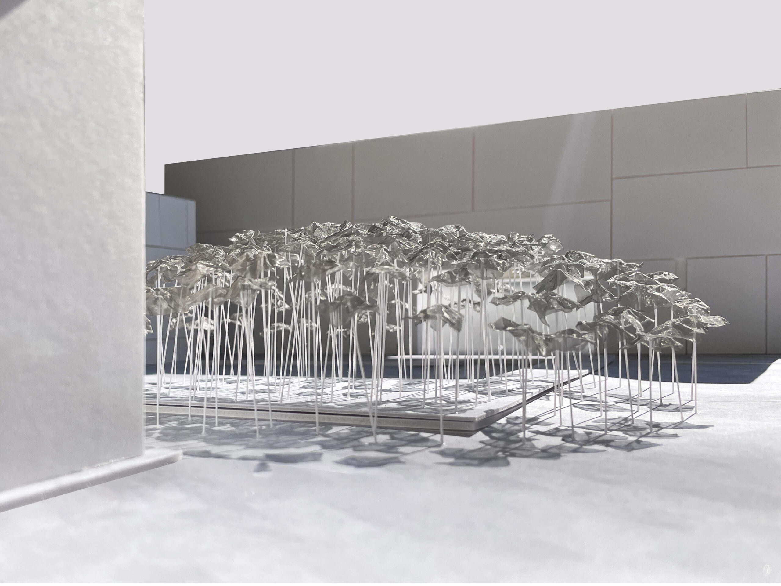Sa toiture en maille d’acier inoxydable, suspendue sur 152 colonnes fines et souples, repose sur des bases sphériques en béton : chacune peut bouger presque imperceptiblement. Ainsi, le pavillon devient une danse de motifs changeants, une chorégraphie d’ombres.