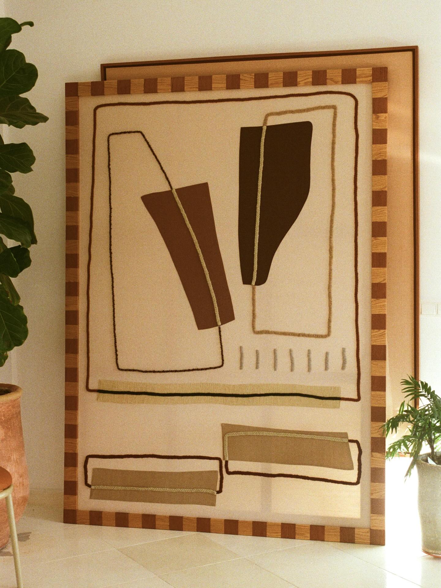 HADAS, Mahogany and walnut damier frame with intricate beaded and wool embroidery on handwoven textile.