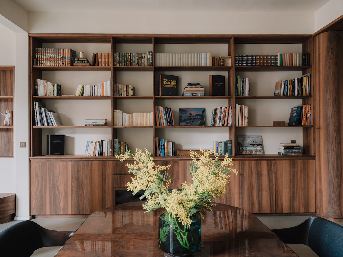 La bibliothèque et la cuisine forment un ensemble majestueux, pensé comme un élément architectural autonome. L’enduit décoratif, dans une teinte assortie à la pierre de façade, appliqué sur les murs et plafonds du salon et de la salle à manger, capte et adoucie la lumière naturelle.