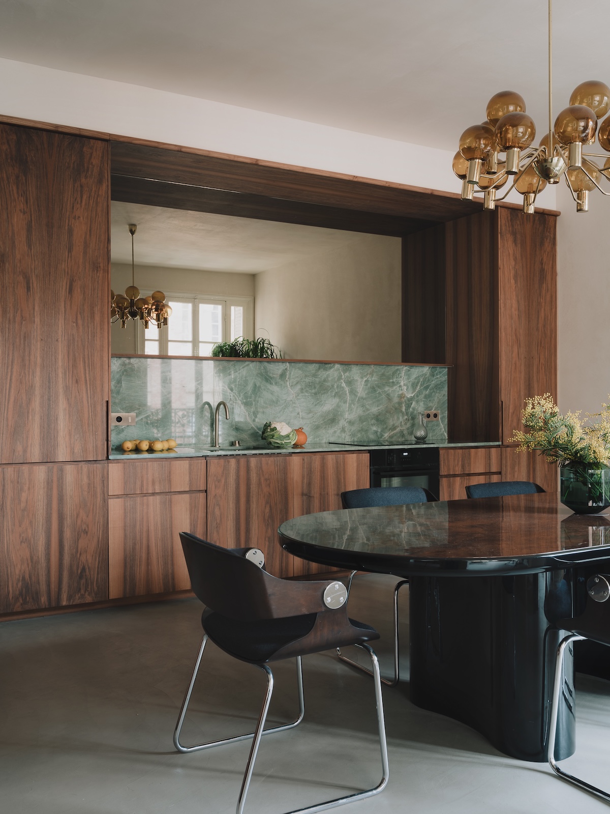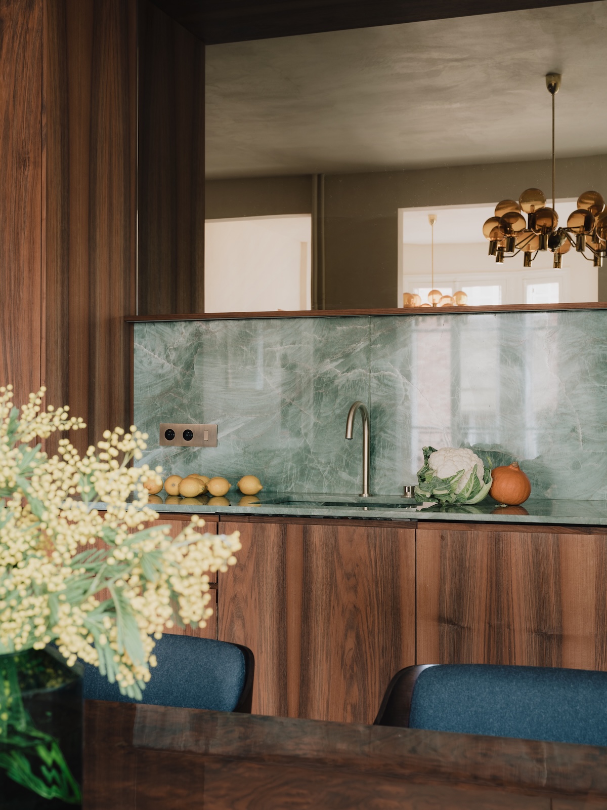 Le salon, conçu sur-mesure, s’adapte à la forme de la pièce en créant des canapés qui mettent en valeur les fenêtres anciennes (seul reste de l’intérieur de l’époque). Côté cuisine, la crédence et le plan de travail se parent de quartzite « jadore », une structure cristalline presque transparente, dans une teinte vert émeraude.