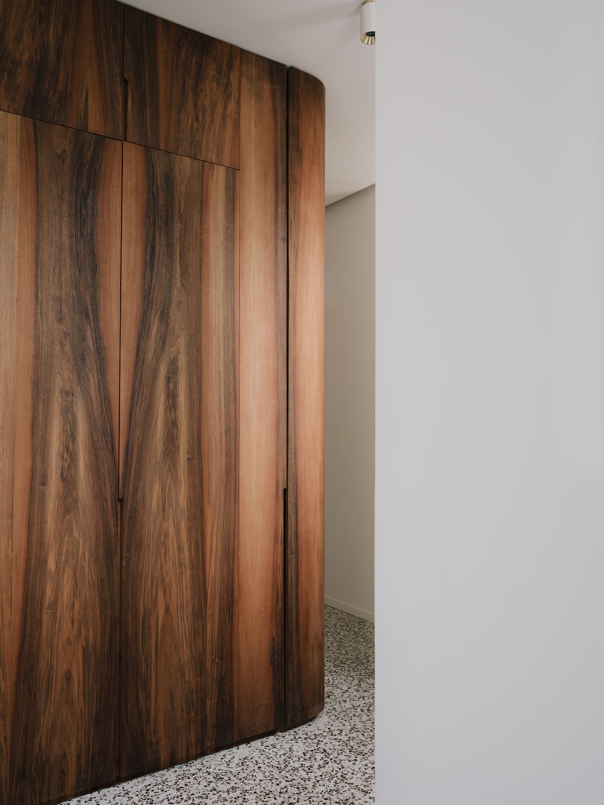 La zone nuit est séparée par un couloir au tapis de terrazzo, formant une galerie dédiée à une unique sculpture: un cactus. La courbe du placard rappelle celle de la banquette et de l’entrée pour accompagner le déplacement dans l’appartement.