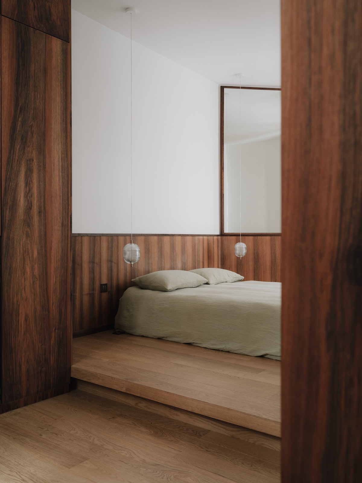 L’entrée a été pensée comme une zone de transition immersive, où le changement de matériaux annonce l’univers du reste de l’appartement. Les meubles intégrés en noyer français structurent l’espace.
