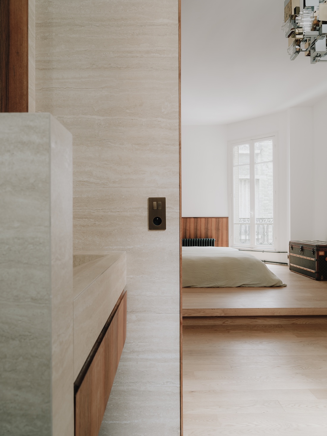 La chambre, ouverte sur un dressing et une salle d’eau en travertin, forme un vaste ensemble, hiérarchisé par le changement de niveau du sol. La double orientation crée une impression d’ouverture et de fluidité entre les différentes zones.