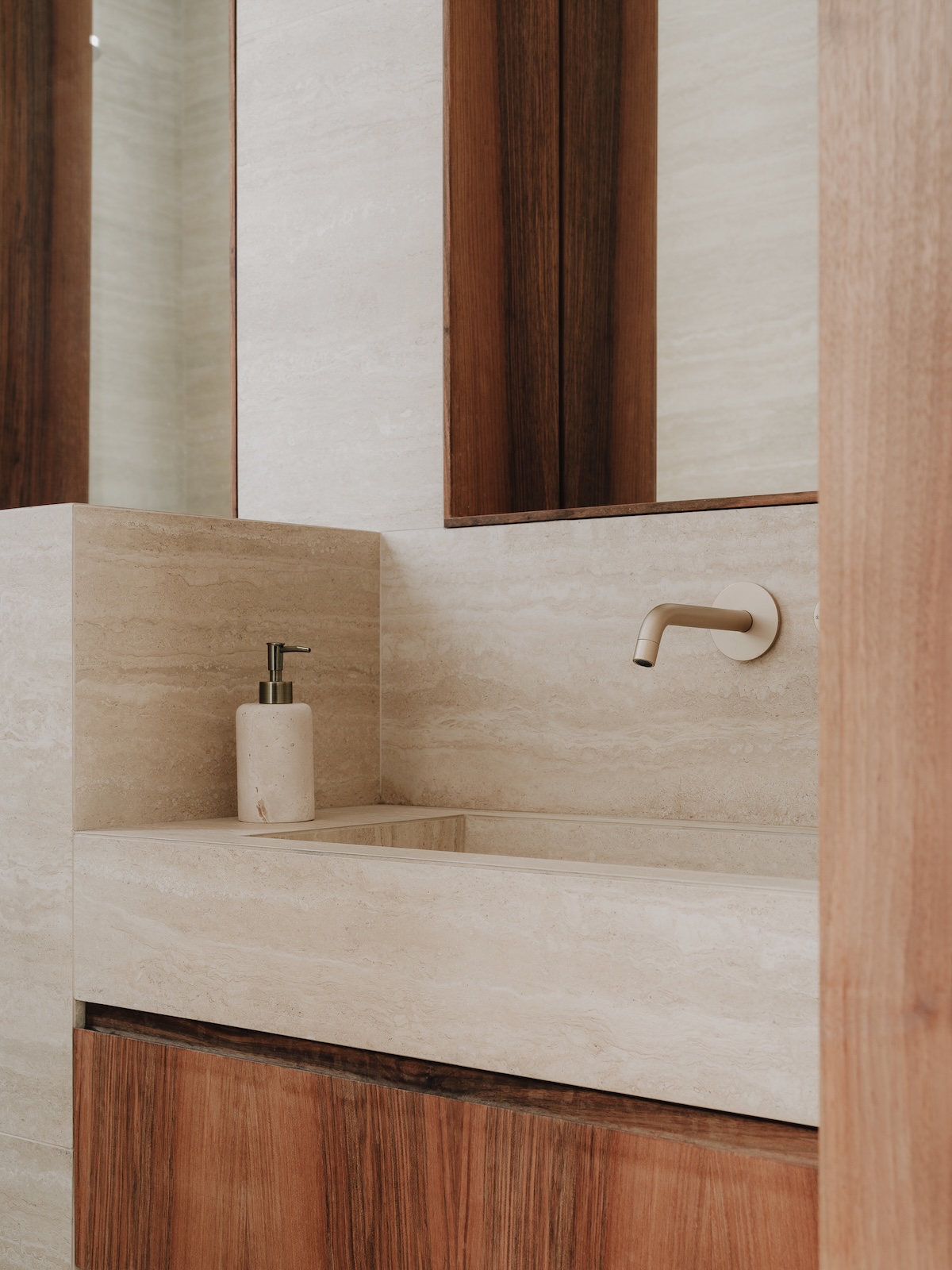 le noyer français du Périgord, le béton ciré, le terrazzo, et le travertin.