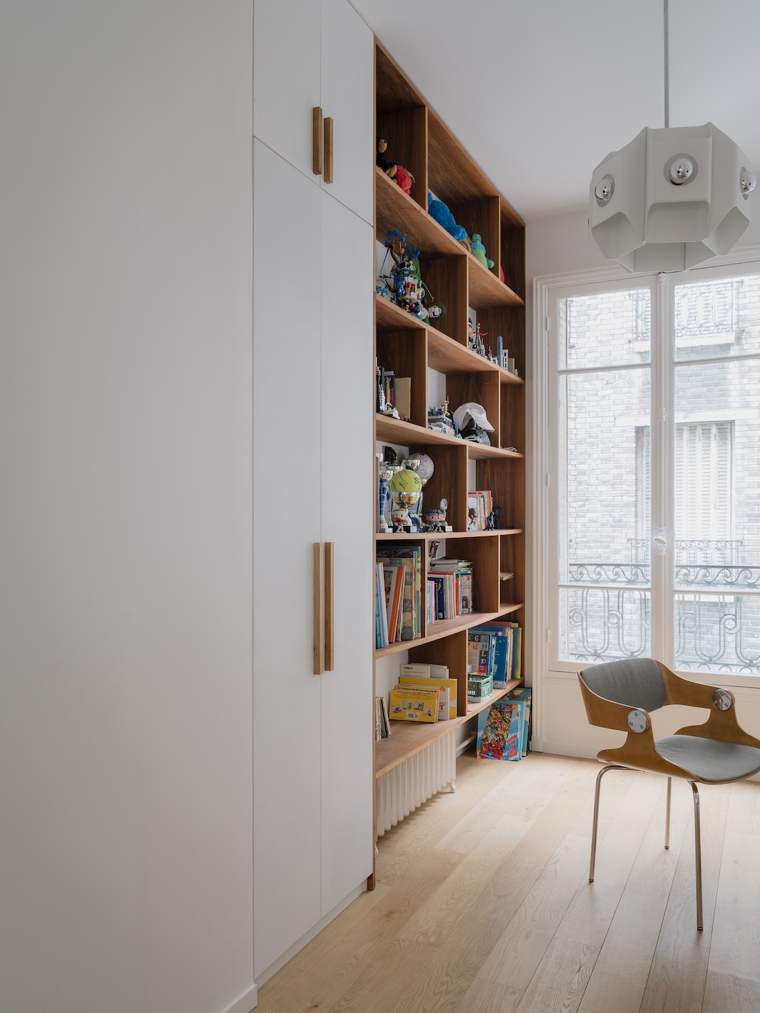 Charlotte Perriand écrivait que l’essentiel est de vivre en harmonie avec son époque. Dans cet appartement, l’intérieur avait été totalement privé de son caractère parisien lors de la dernière rénovation, qui avait eu lieu dans les années 1960. Tout a été démoli, tout sauf les fenêtres.