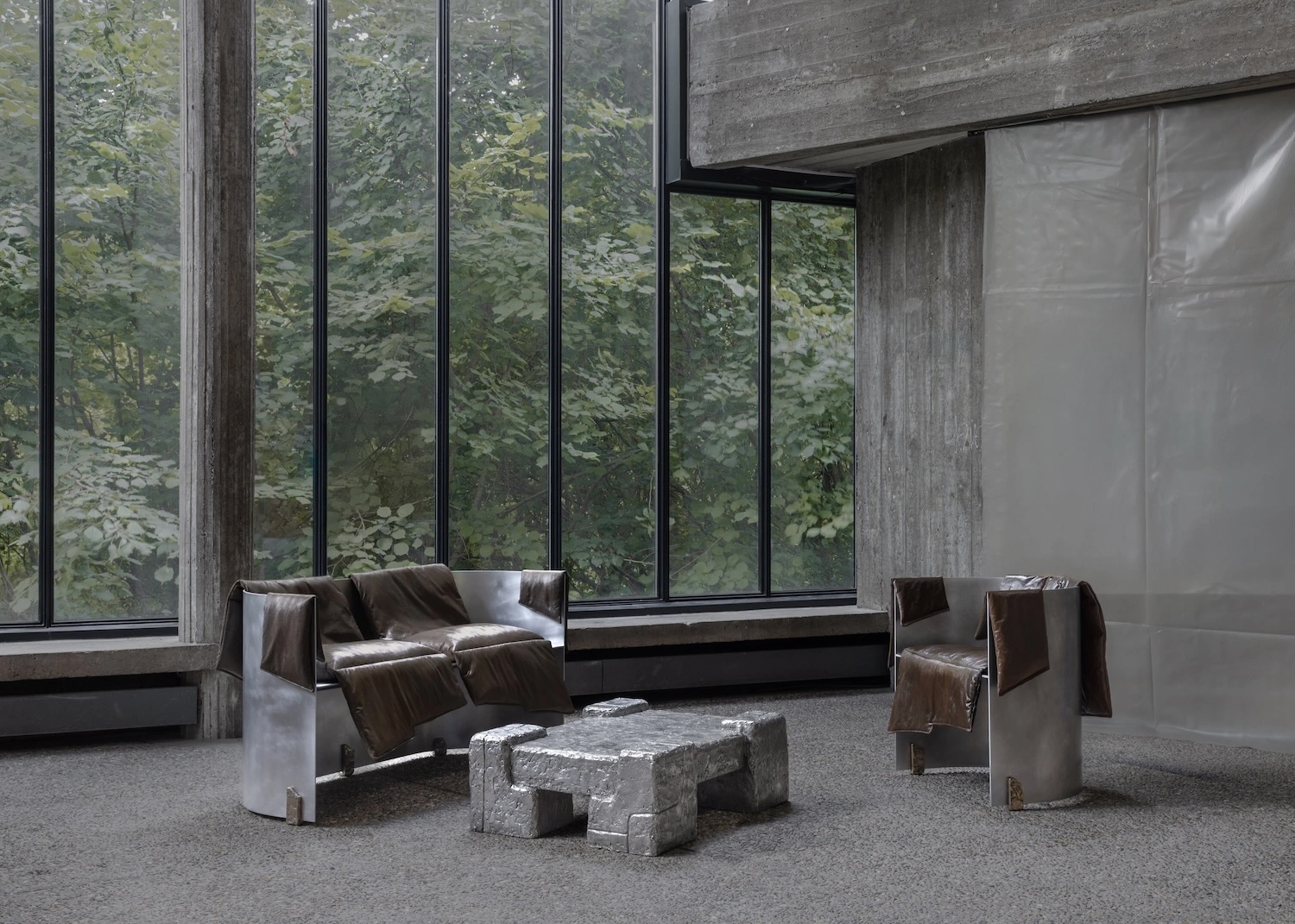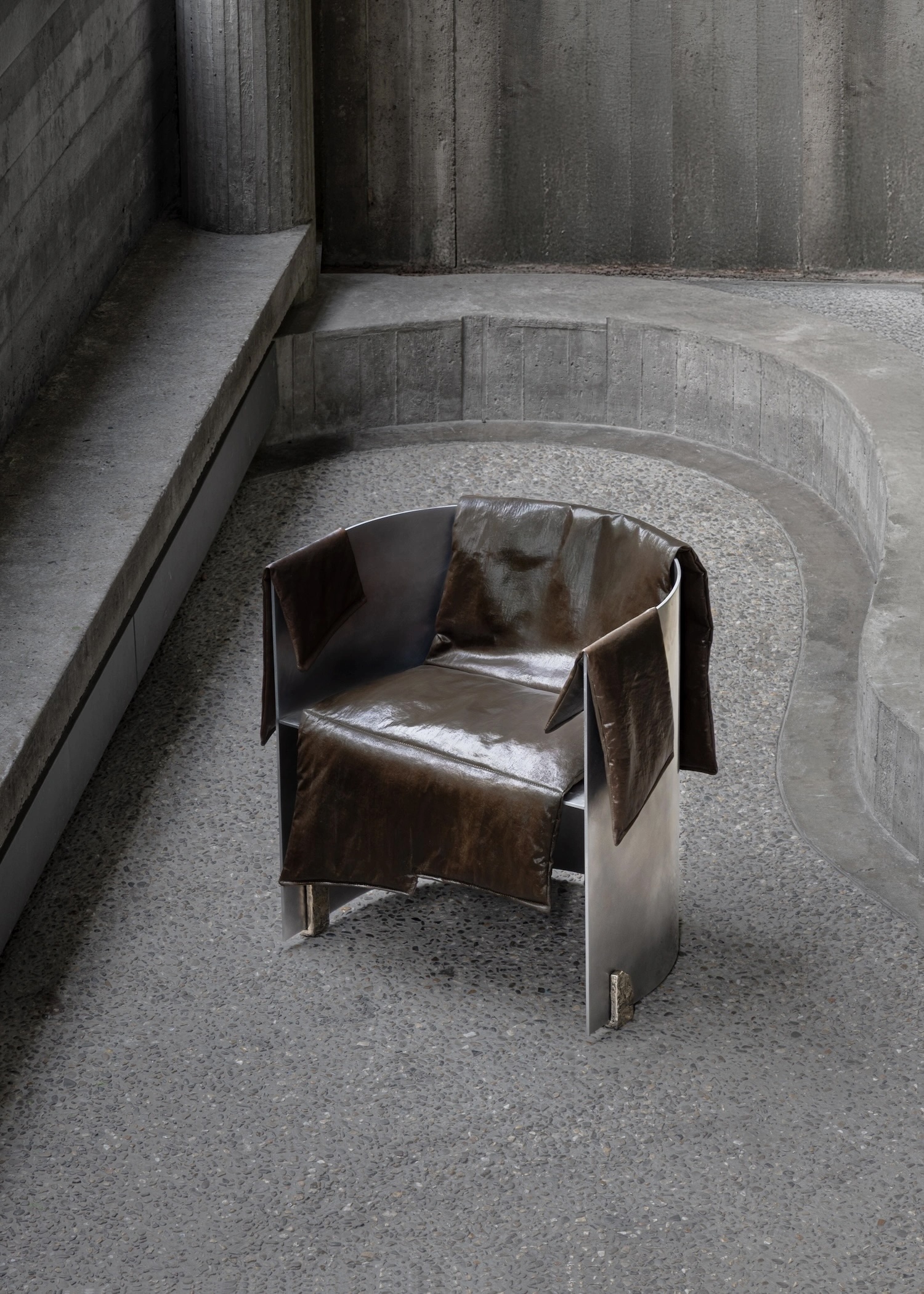 Cette collection, composée d’un banc et d’une chaise minimalistes, incarne un langage architectural précis tout en résistant à la froideur d’une simple logique structurelle. C’est dans cette tension, entre abri et douceur, que son œuvre prend tout son sens.