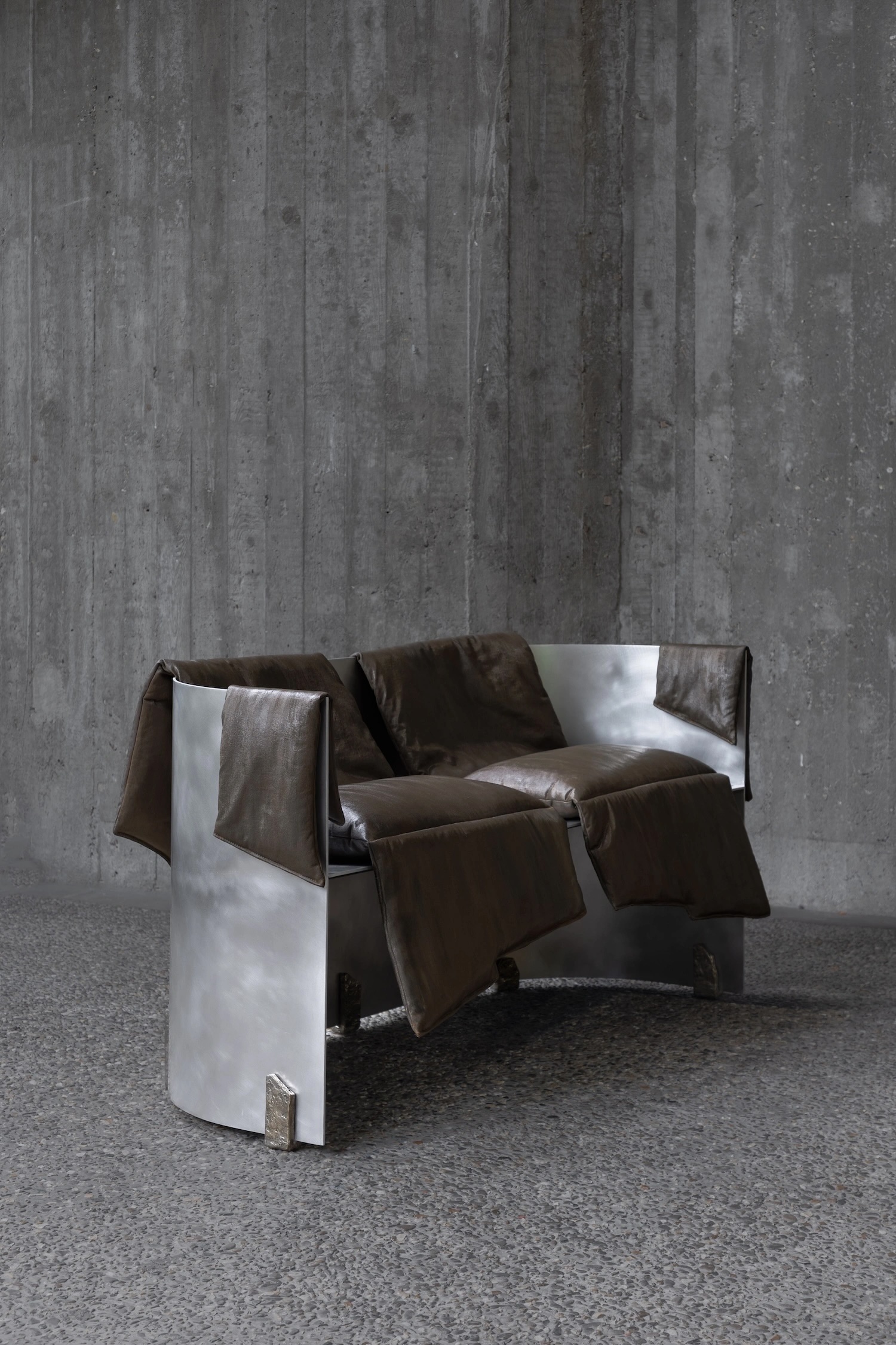 Le vocabulaire stylistique de Tangelder s’inspire d’un mélange de fragments de bâtiments, de techniques de construction et de matériaux superposés. Le banc Reworked illustre ce concept avec une ossature en aluminium brossé, à la fois rigide et réfléchissante, contrastant subtilement avec des coussins en coton laqués à la main.