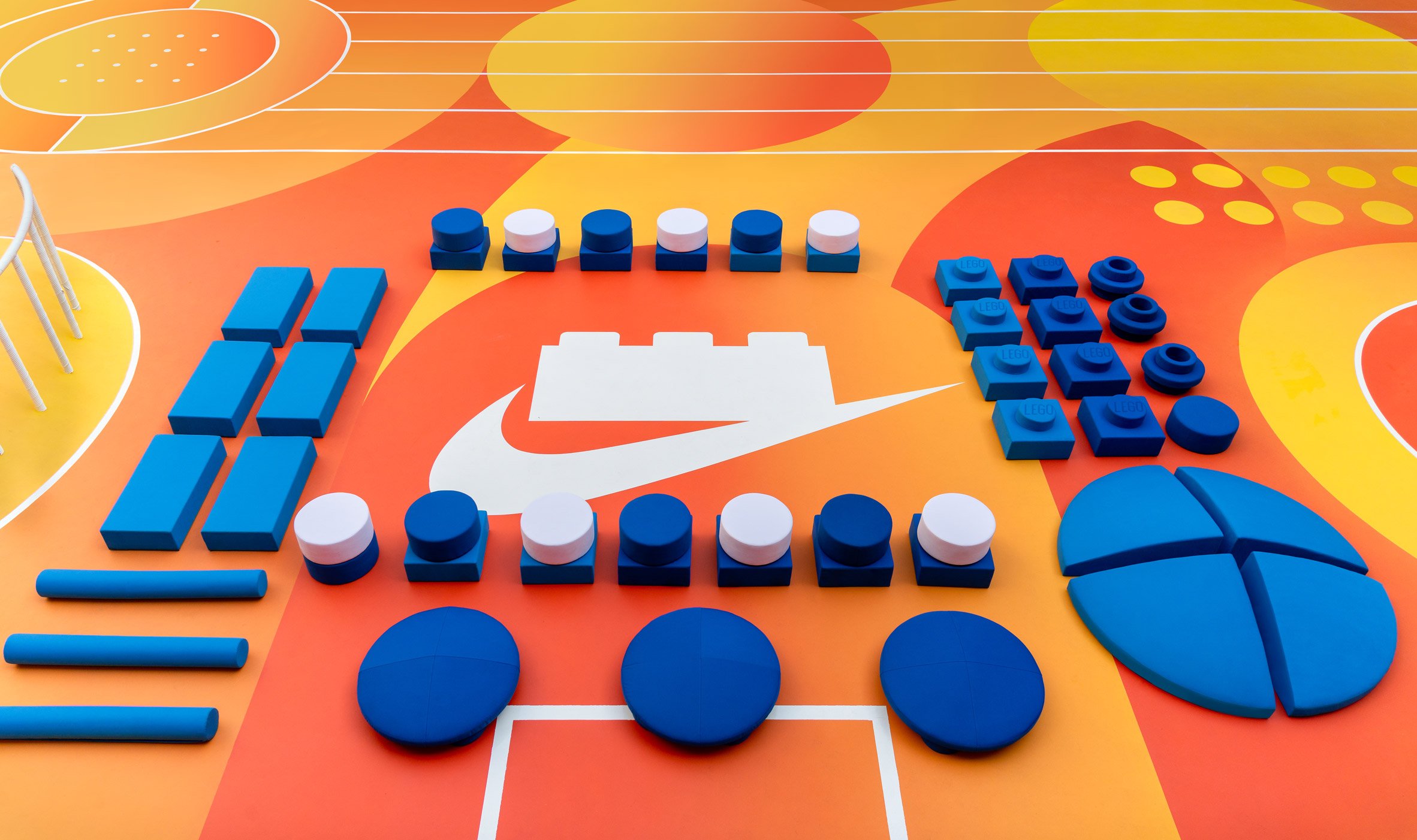 Pour animer l’aire de jeux, Lego et Nike ont créé une série de blocs bleus légers inspirés des briques emblématiques de Lego.