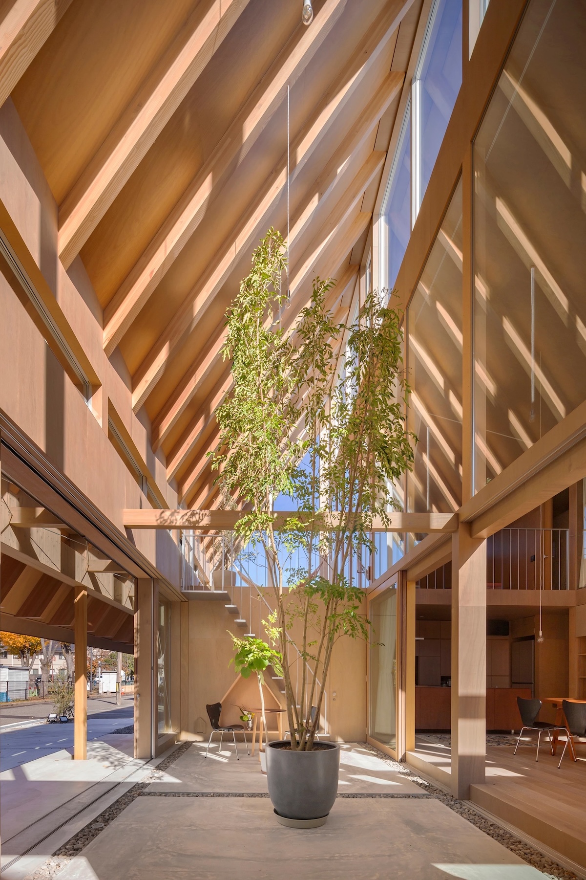 Dans le projet, le ‘doma’, lieu d’interaction avec les hôtes selon l’architecture traditionnelle Hokuriku, est réimaginé comme un jardin intérieur doté d’un grand toit qui capte la lumière du soleil, permettant ainsi de vivre en plein air même par mauvais temps et par temps froid.