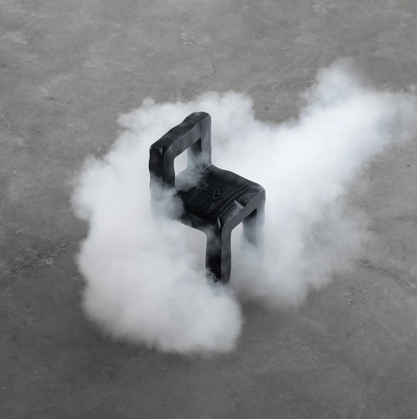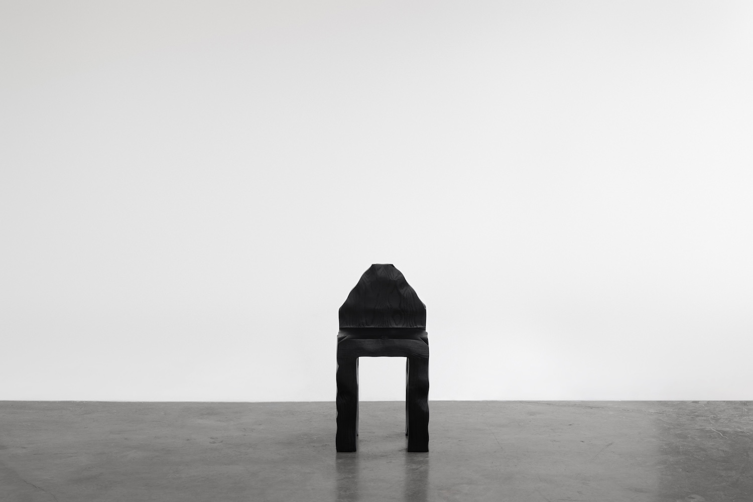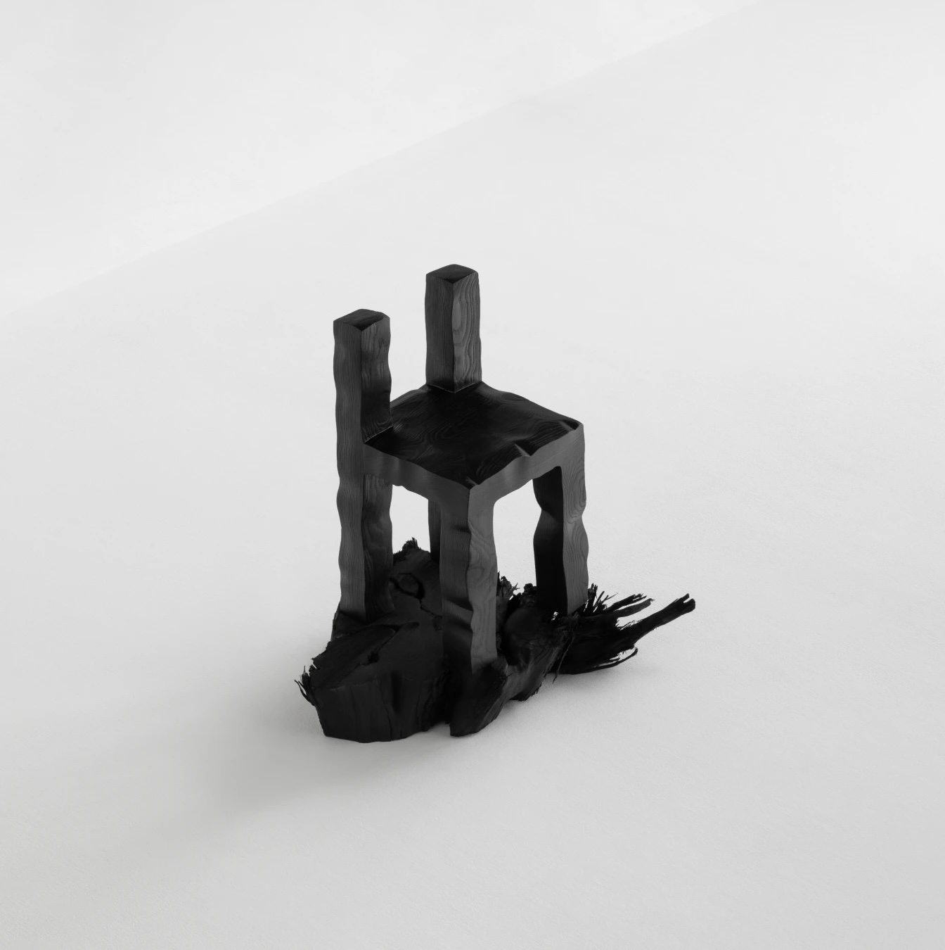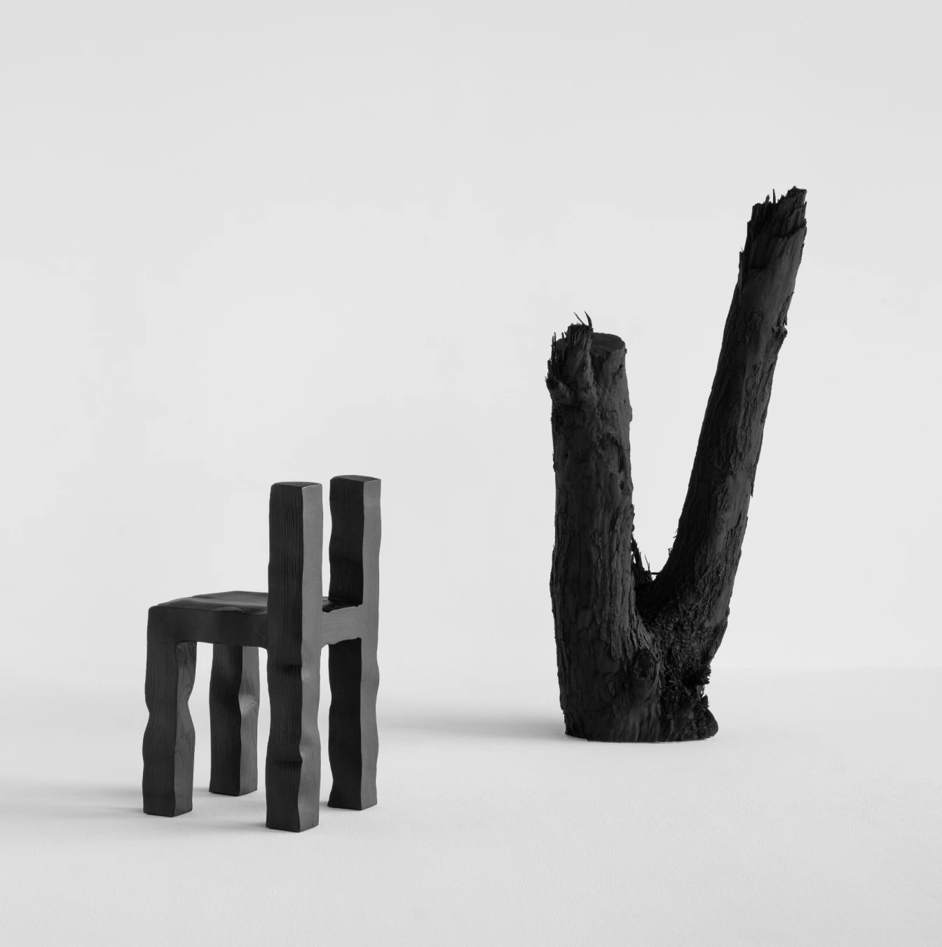 Ancrée dans l’idéalisme forestier de John Muir, la collection propose une traduction poétique de l’épuisement professionnel en processus matériel. La technique Shou Sugi Ban, une ancienne méthode japonaise de préservation du bois par le feu, n’est pas une simple élégance esthétique. Elle devient ici métaphore : l’expérience de l’épuisement et de la régénération du designer prend forme dans le veinage noirci du frêne, évoquant la transformation par la flamme.
