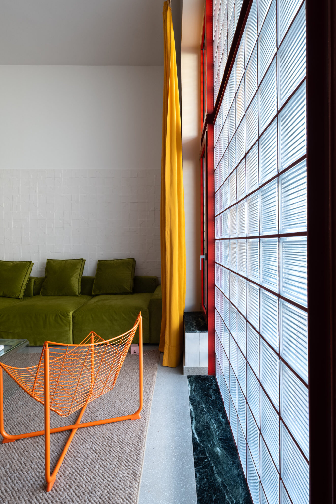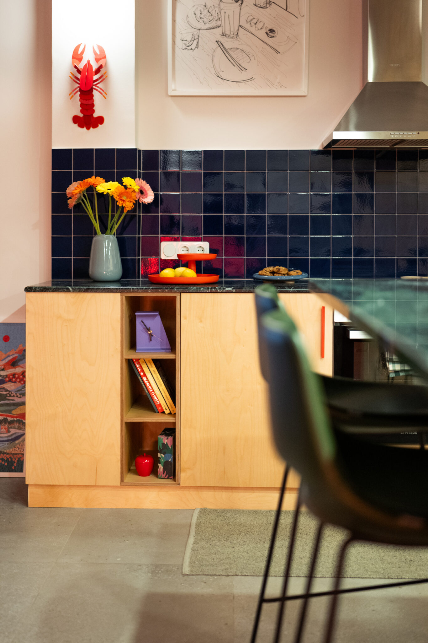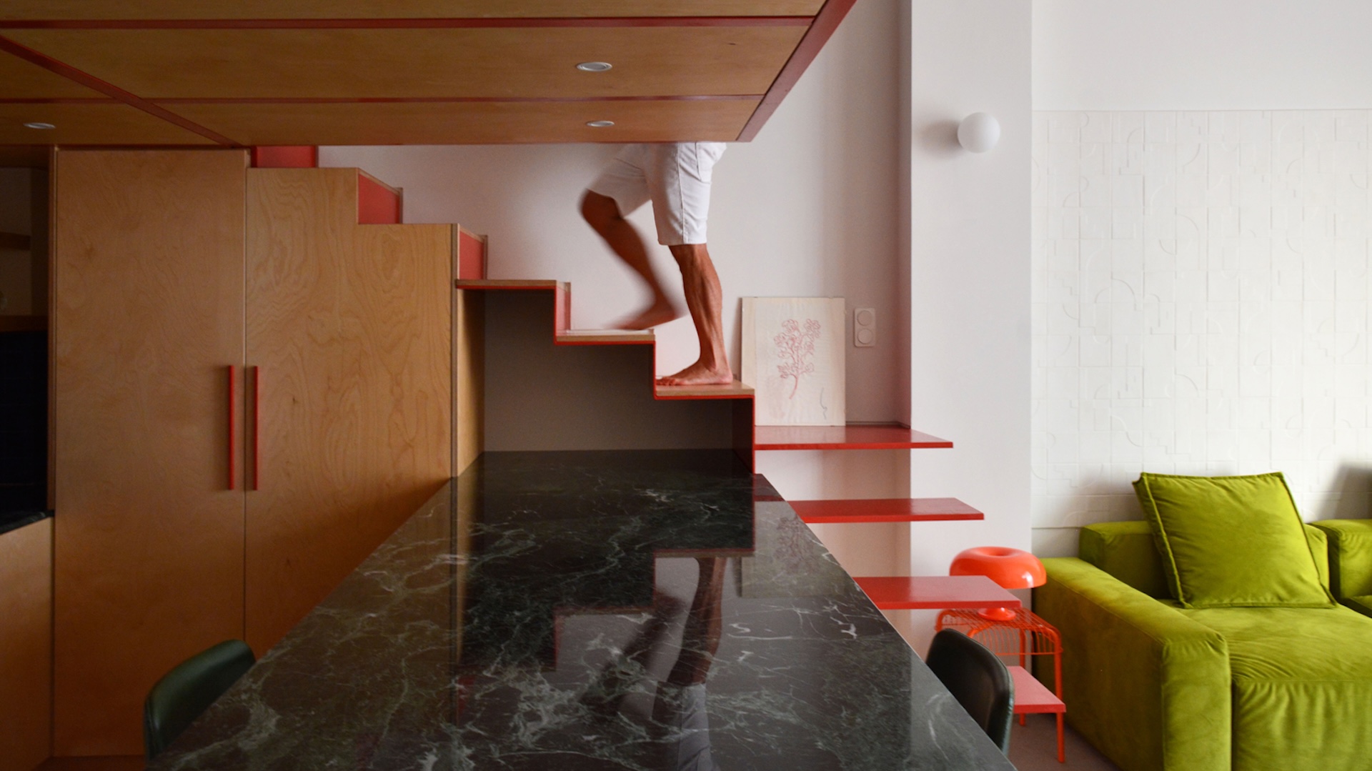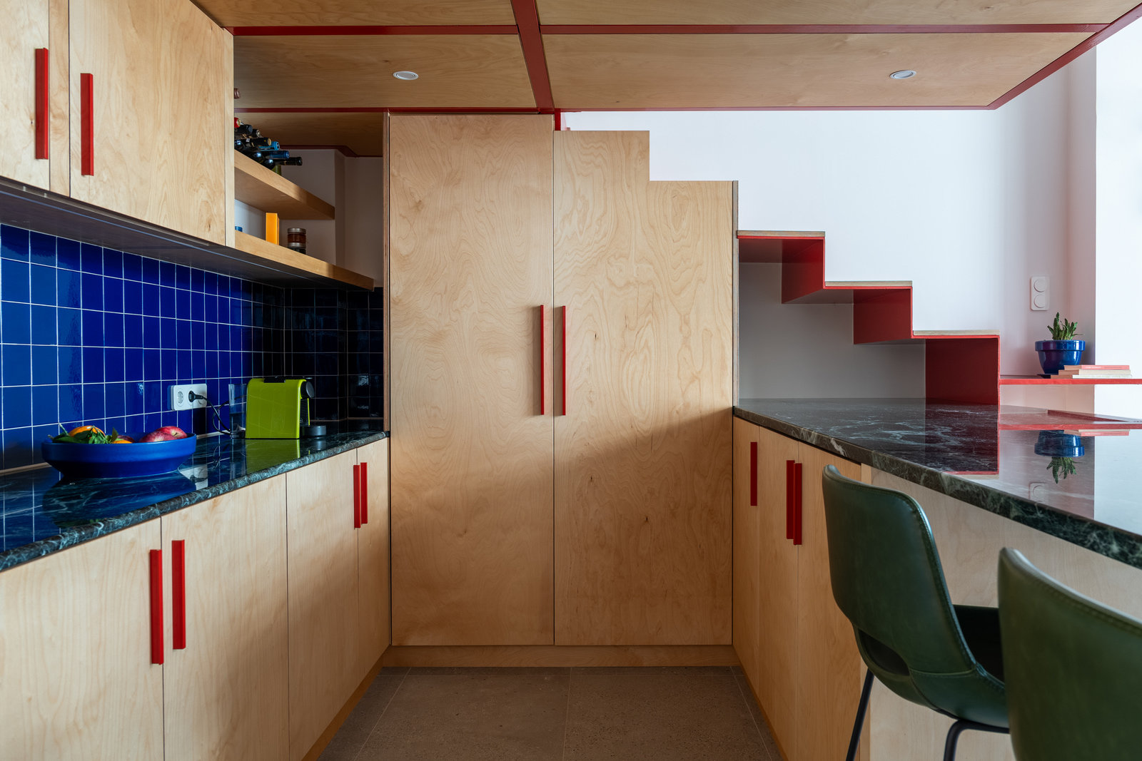 Le marbre vert de Tinos, les textiles épais, le carrelage aux couleurs vives et le contreplaqué de bouleau brut ont été choisis pour renforcer le caractère contemporain de l’appartement.