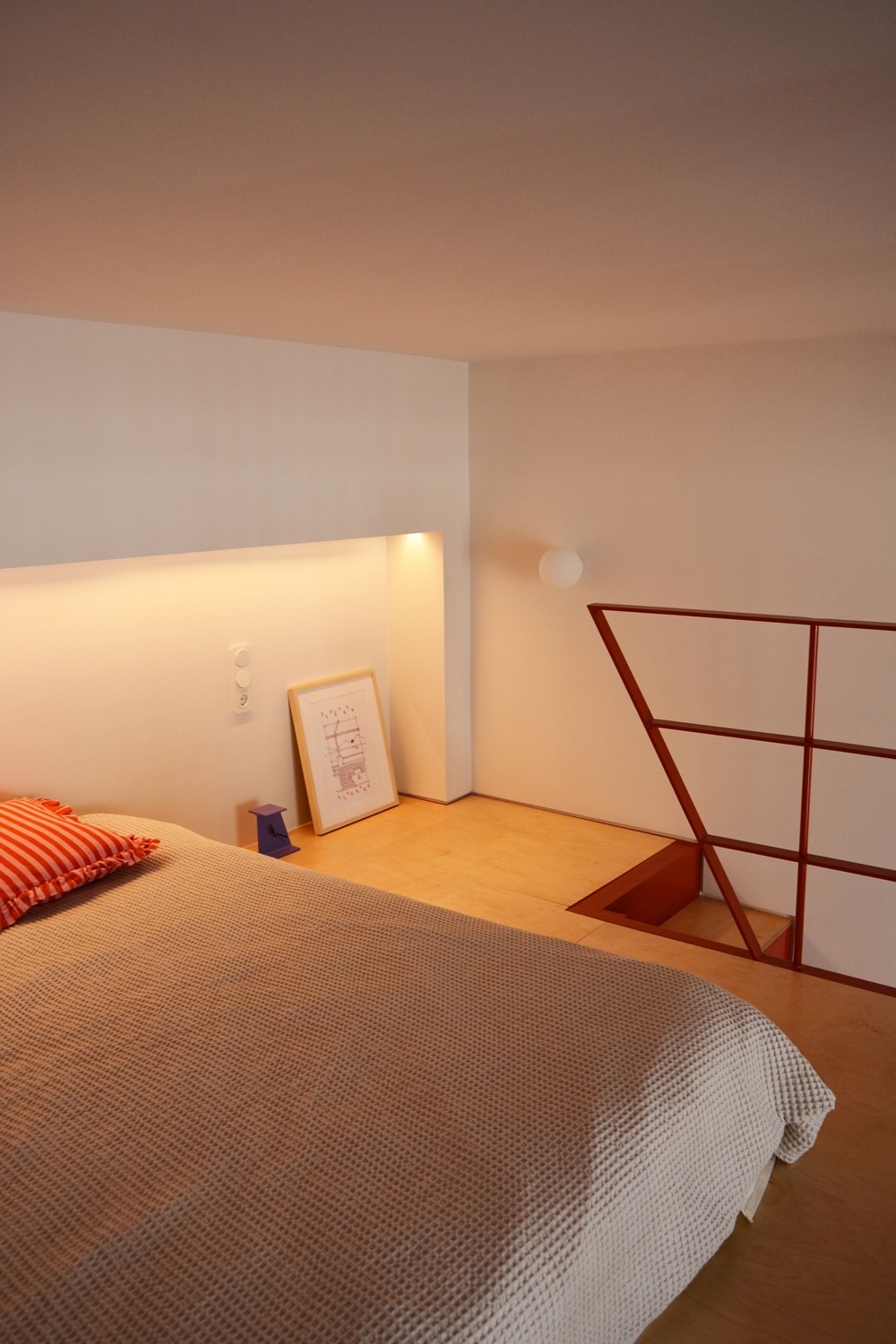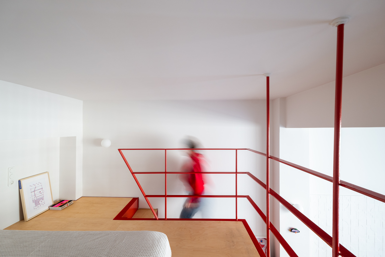 Tirant parti de la hauteur sous plafond existante de 4,20 m, la mezzanine a été conçue comme un espace ouvert et intégré entre deux niveaux, où la lumière naturelle relie les différents espaces.