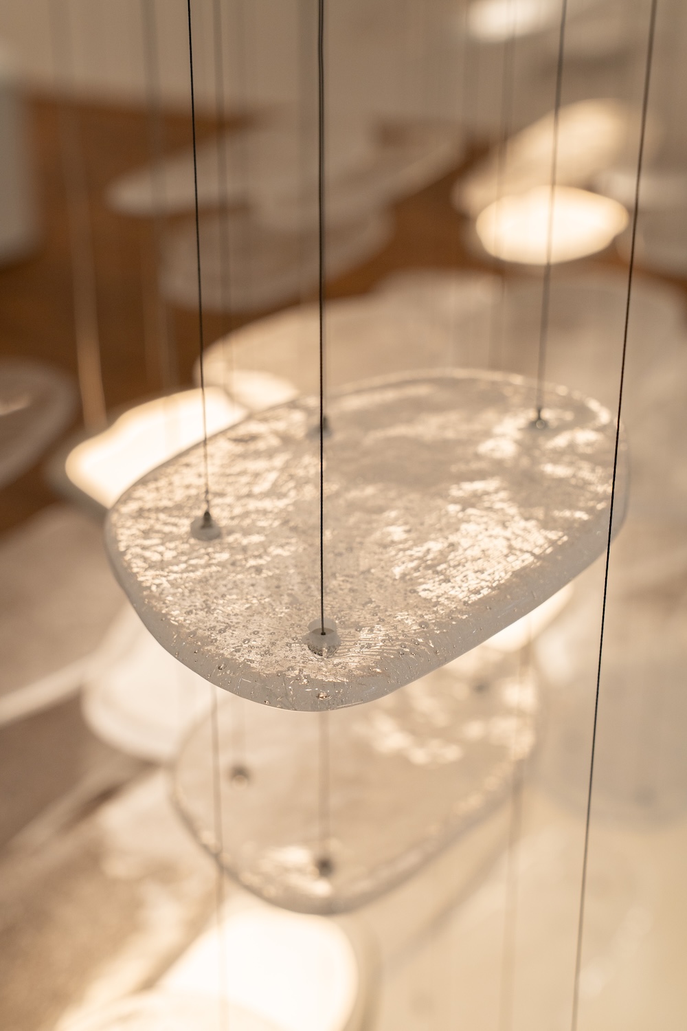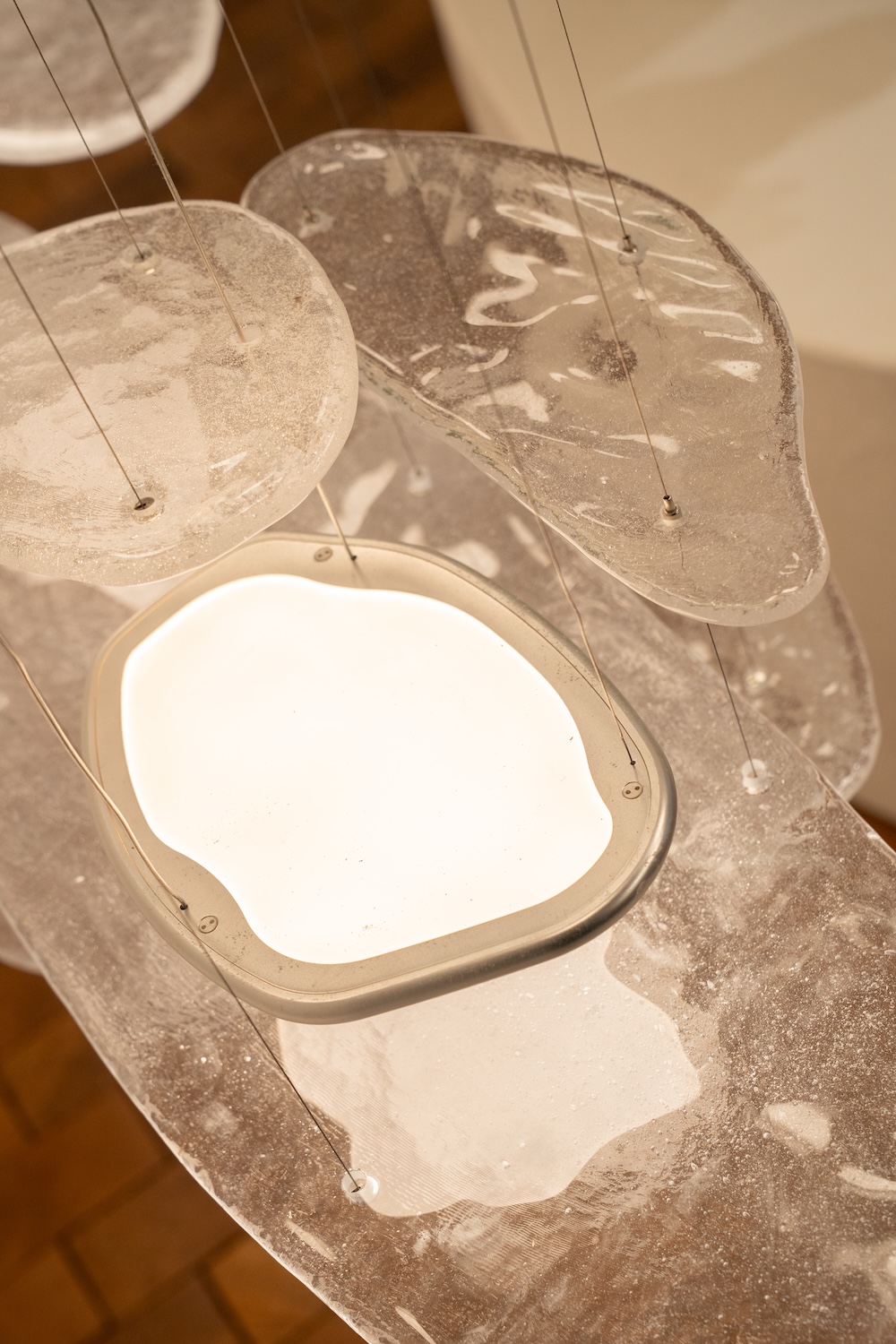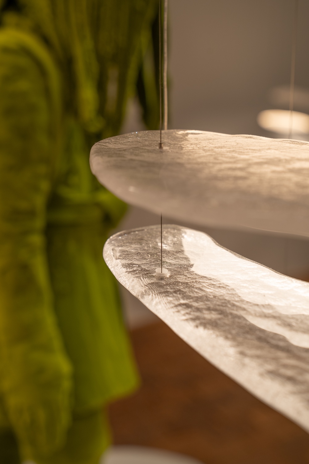 Au coeur de l’exposition, Bruma, une installation in situ signée Giopato & Coombes. Des modules de verre suspendus flottent dans l’espace tels une constellation de brume, transformant le lieu en un ensemble lumineux qui réagit à la présence des visiteurs. Cette composition, véritable métamorphose spatiale de la perception, efface la frontière entre le visible et l’invisible.