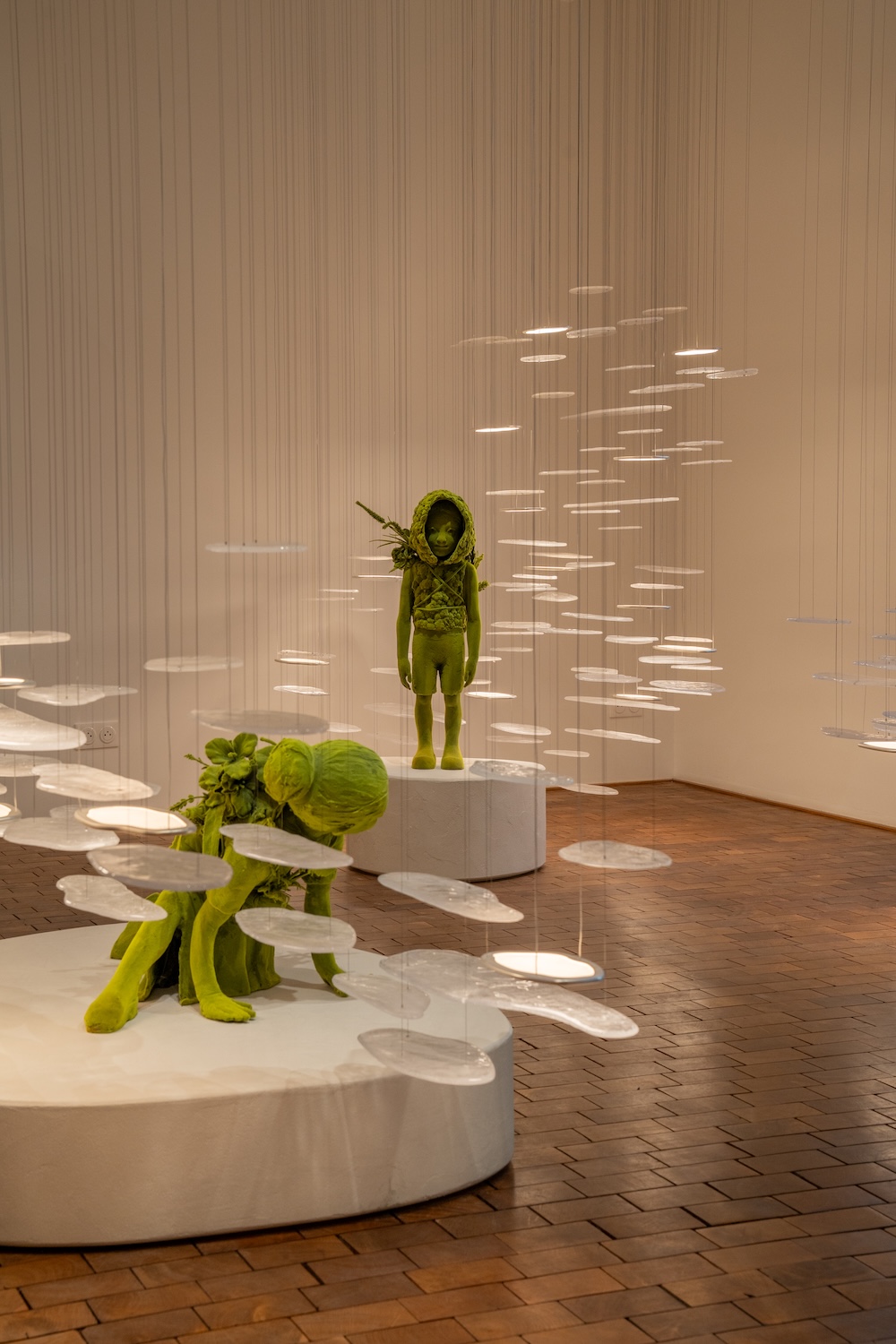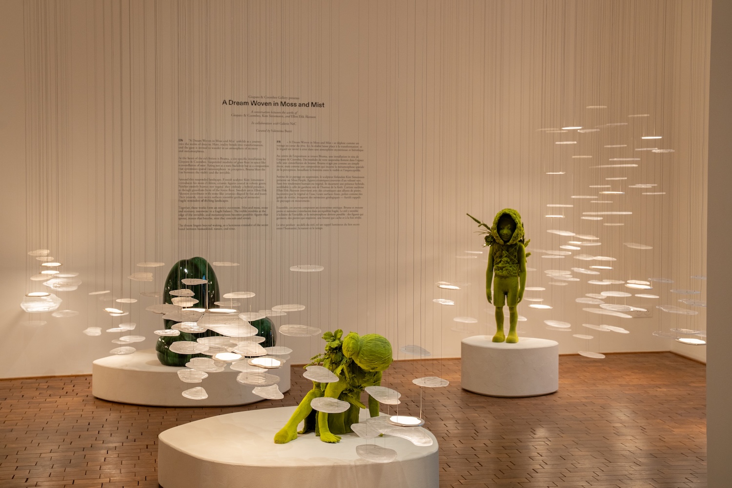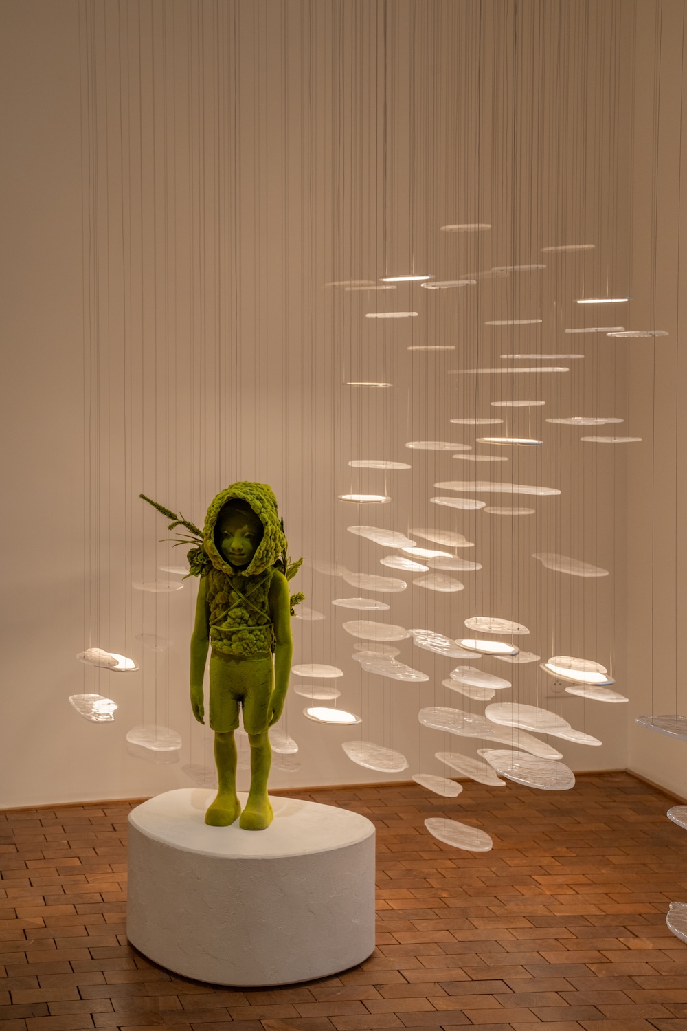 – les Moss People, de l’artiste finlandais Kim Simonsson, incarnation d’une enfance étrange et transfigurée. Des sculptures en céramique recouvertes d’un vert chatoyant brouillent les frontières entre l’humain et le végétal, évoquant des gardiens féeriques qui se fondent dans le sol de la forêt.