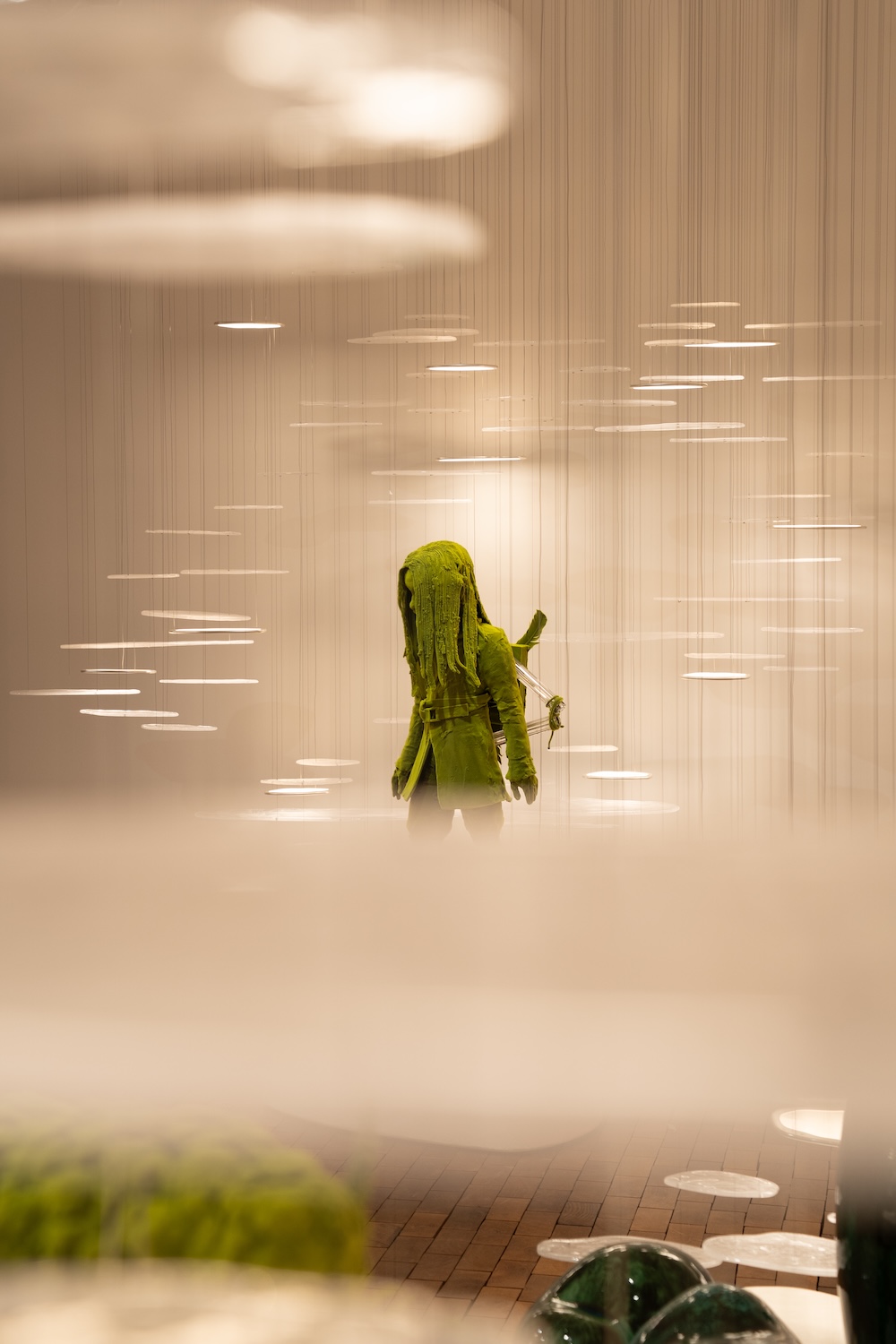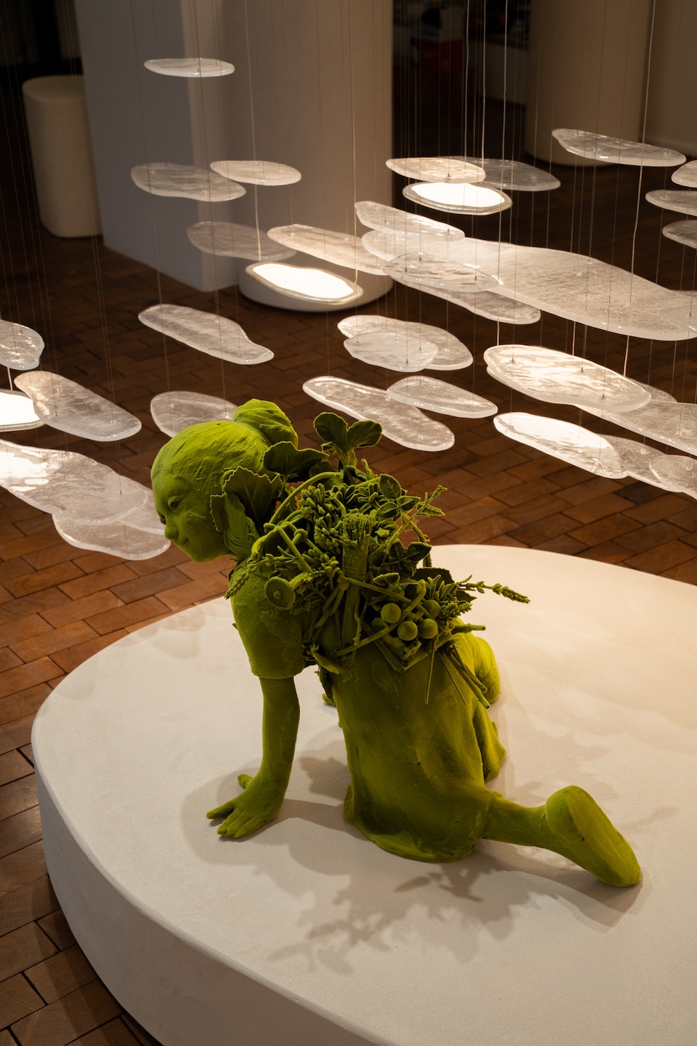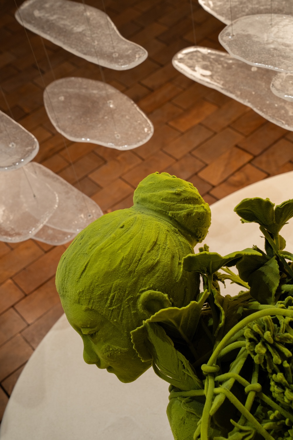 – les Moss People, de l’artiste finlandais Kim Simonsson, incarnation d’une enfance étrange et transfigurée. Des sculptures en céramique recouvertes d’un vert chatoyant brouillent les frontières entre l’humain et le végétal, évoquant des gardiens féeriques qui se fondent dans le sol de la forêt.