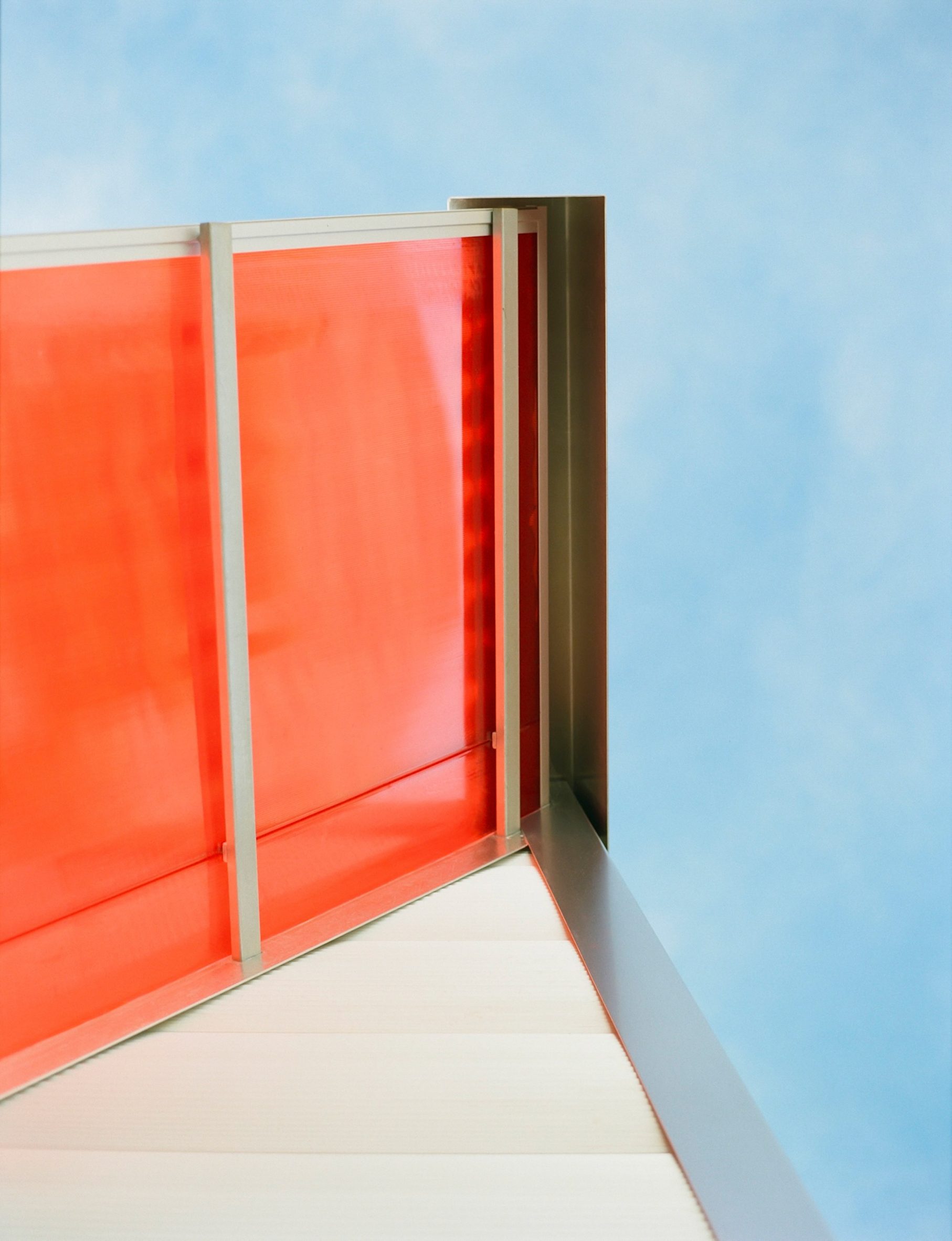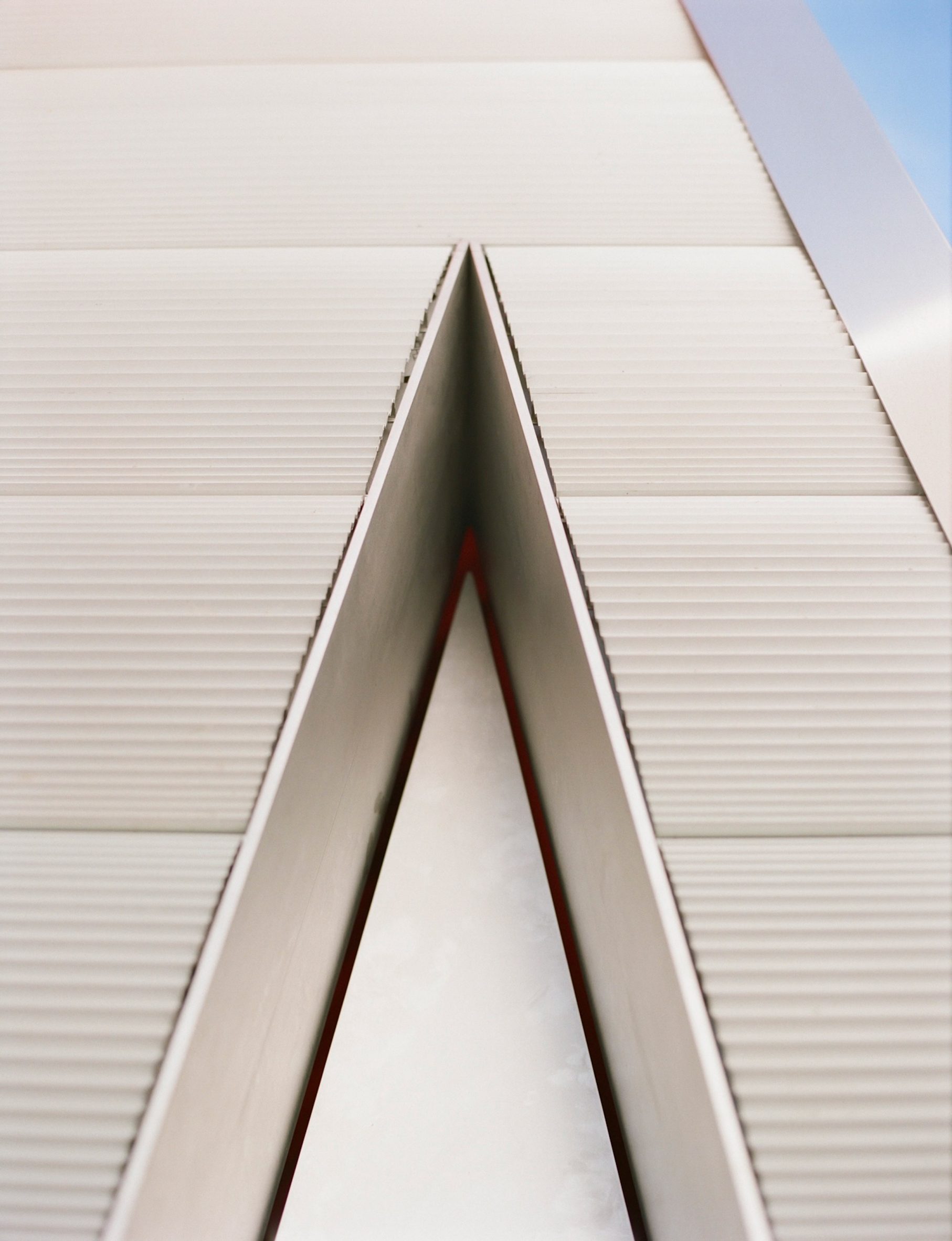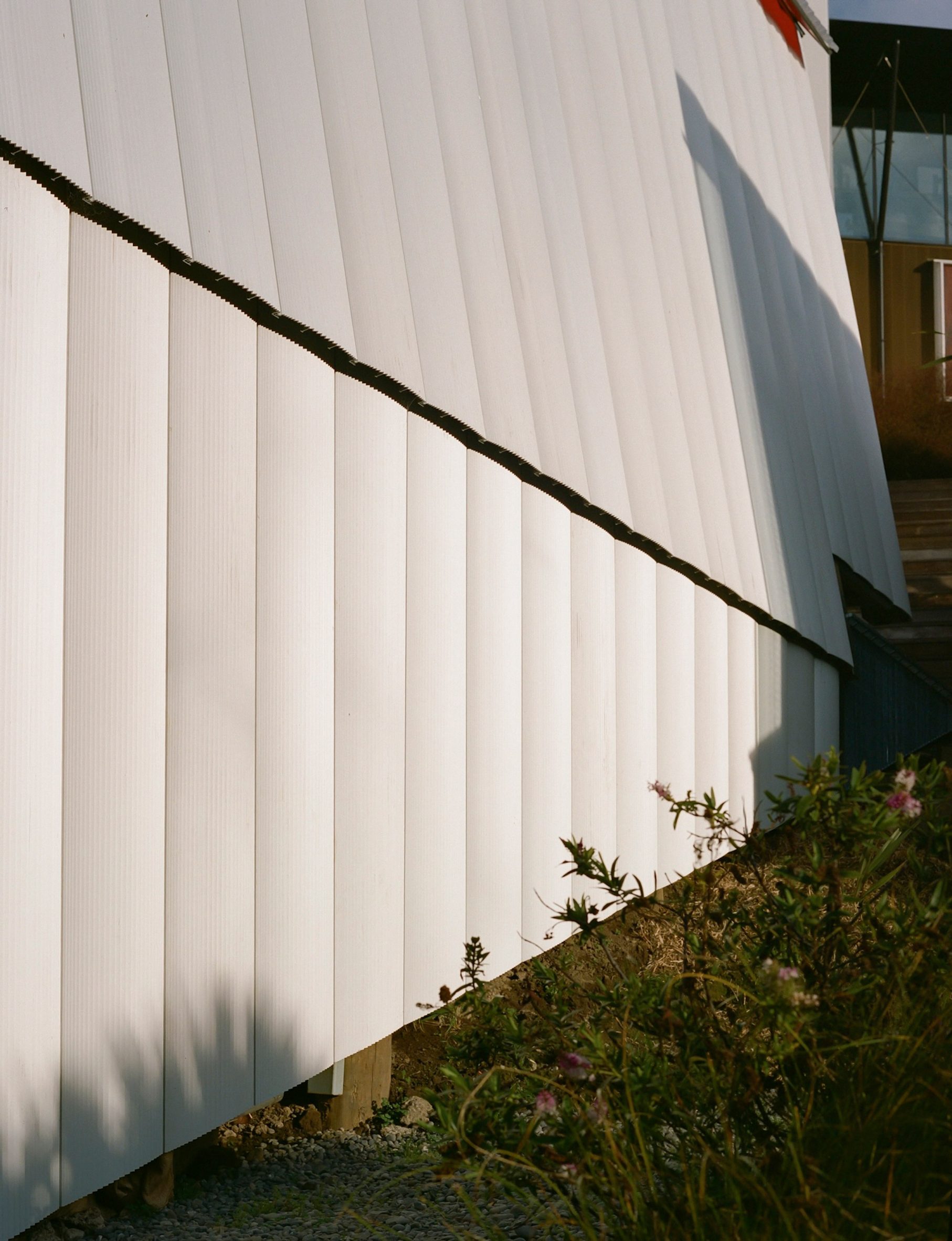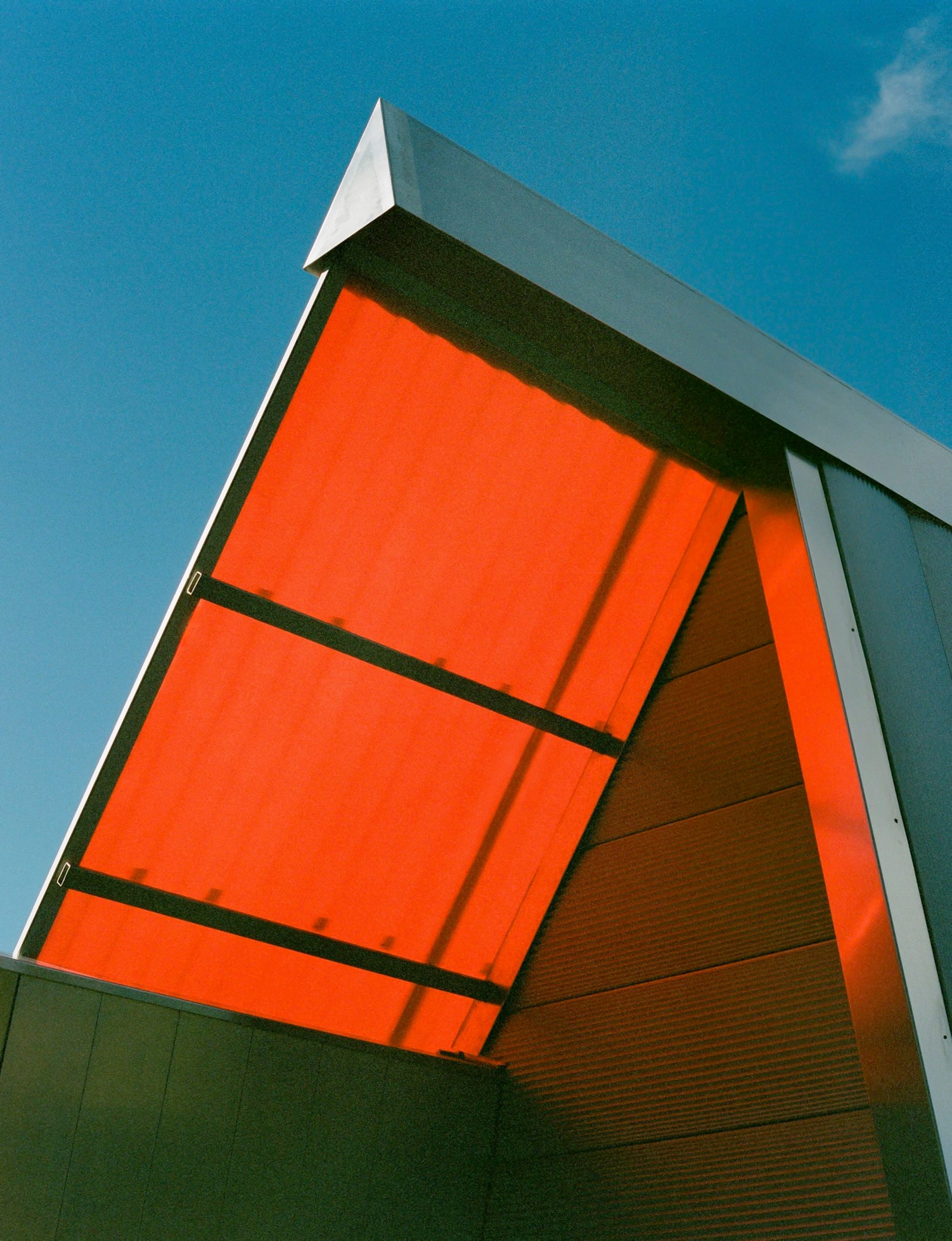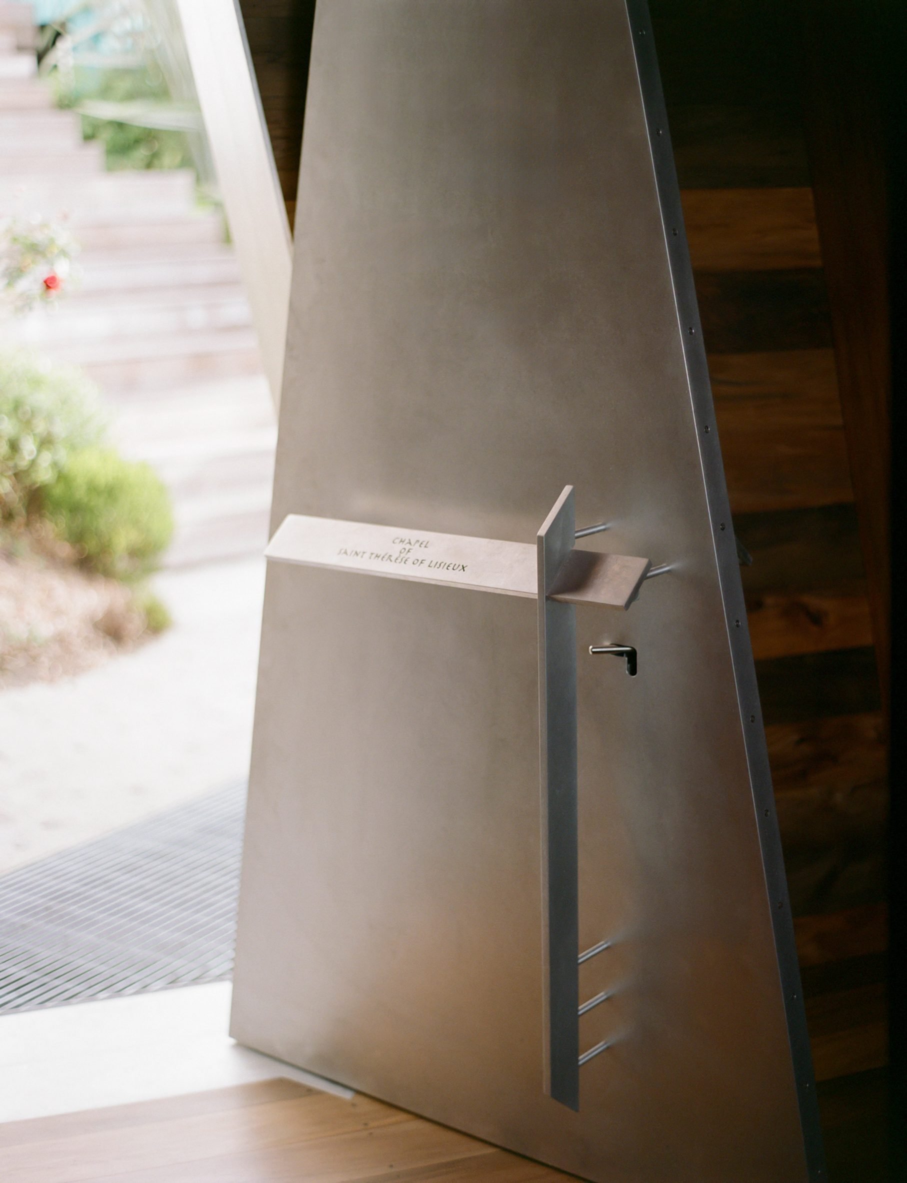 Elle repose sur des pilotis en bois, dissimulés à la base par les tôles d’aluminium qui la recouvrent. Une porte en aluminium encastrée, ornée d’une poignée métallique en forme de croix, prolonge ce motif triangulaire.