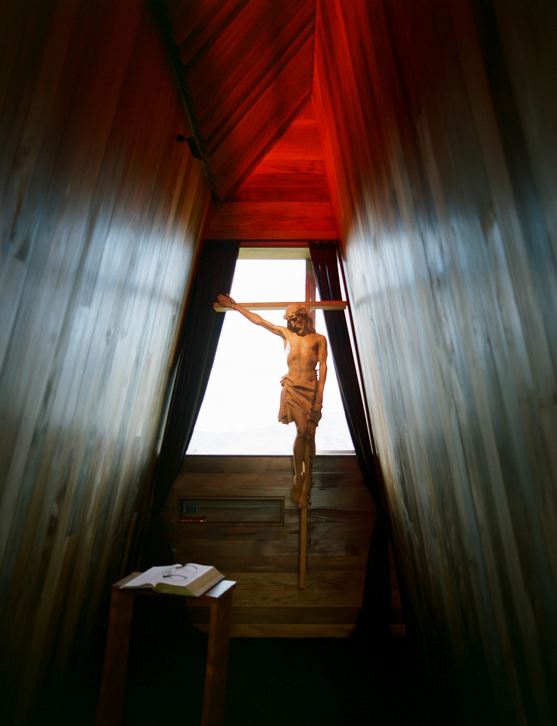 Une sculpture de Jésus en croix, réalisée en bois de récupération par l’artiste local Johnny Hauraki, trône au centre de l’intérieur minimaliste de la chapelle. Derrière la sculpture, une fenêtre donnant sur le port baigne l’espace de lumière, tandis que les panneaux de toit translucides diffusent une douce lueur rougeâtre.