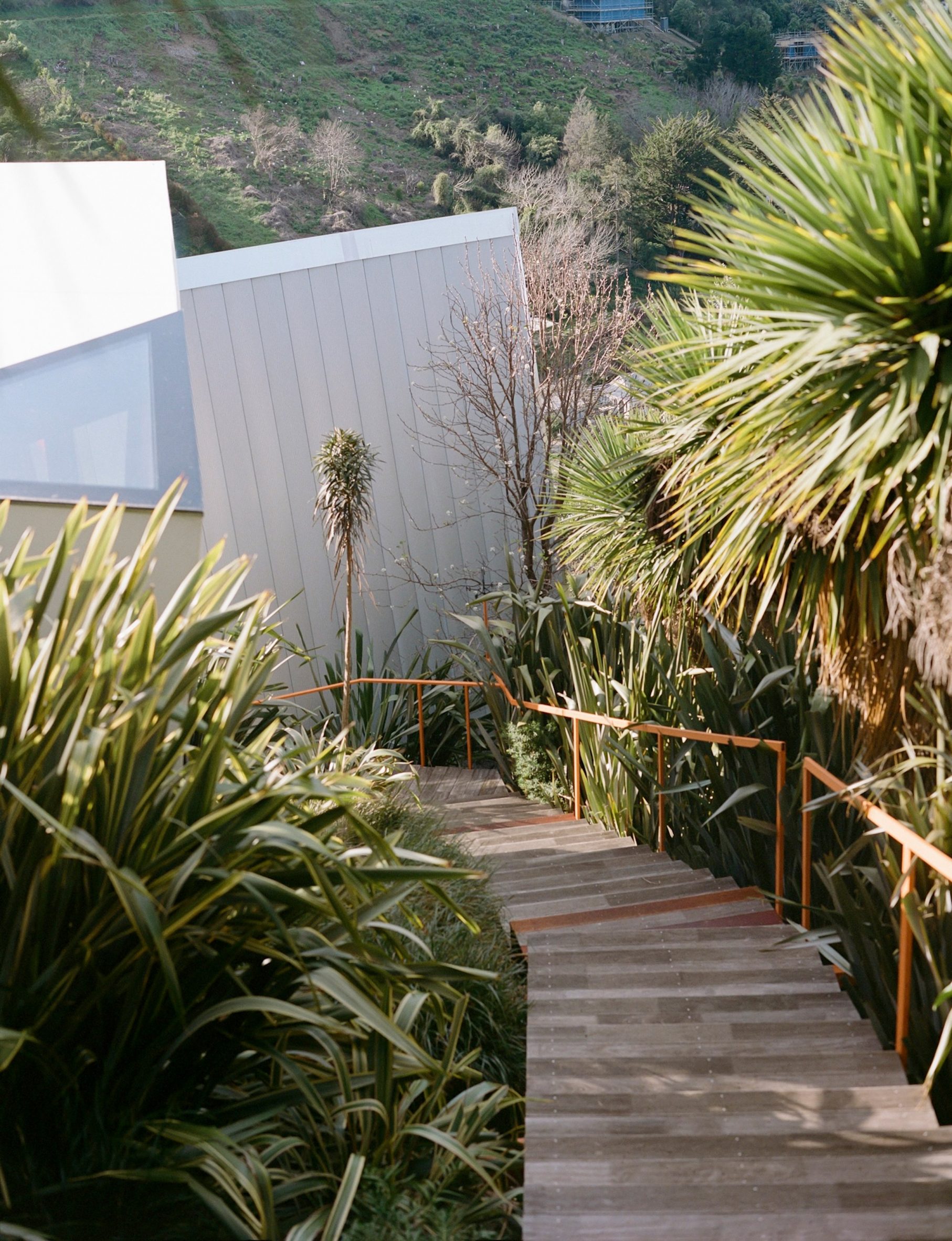 On y accède par un escalier traversant le terrain en pente et une entrée abritée par un sol grillagé et un petit banc en bois. À l’intérieur, Bull O’Sullivan Architecture a opté pour une palette de matériaux plus chaleureux, avec du bois local utilisé pour les murs et le sol.