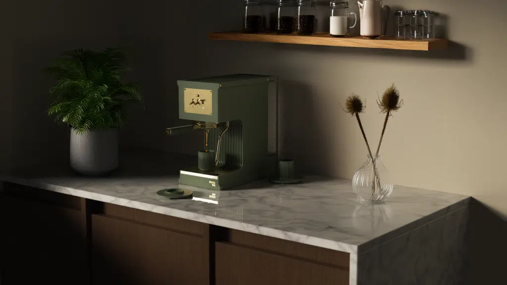 Pour la machine à café, l’enjeu fut de concevoir une structure facilement produite et assemblée, tout en conservant une cohérence visuelle avec les premiers éléments. Chaque pièce de la gamme (bouilloire, accessoires, tasses) partage ce style de lignes verticales et construite autour des contraintes industrielles. On détonne alors pas mal dans le paysage des petits électroménager que nous connaissons.