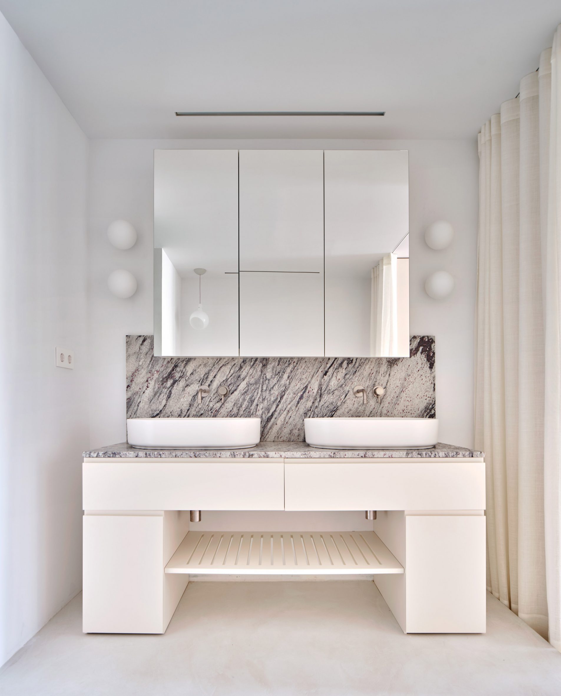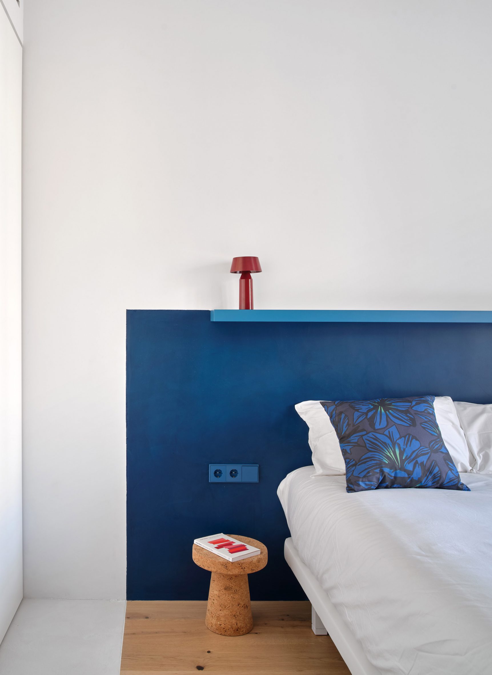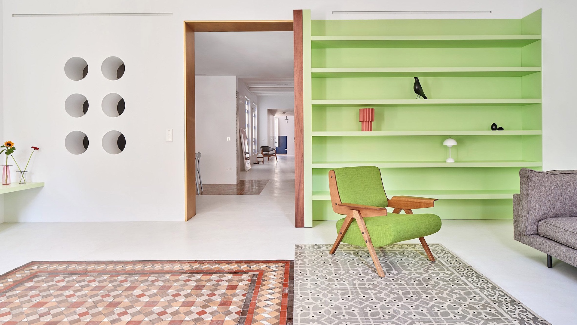 Avant sa rénovation, l’appartement se composait d’un enchevêtrement de petites pièces sombres, encadrées par un patio intérieur et un salon donnant sur la rue. Le cabinet Raúl Sanchez Architects a relié ces deux pièces par un mur de 21 mètres de long qui s’étend d’un bout à l’autre de l’appartement.