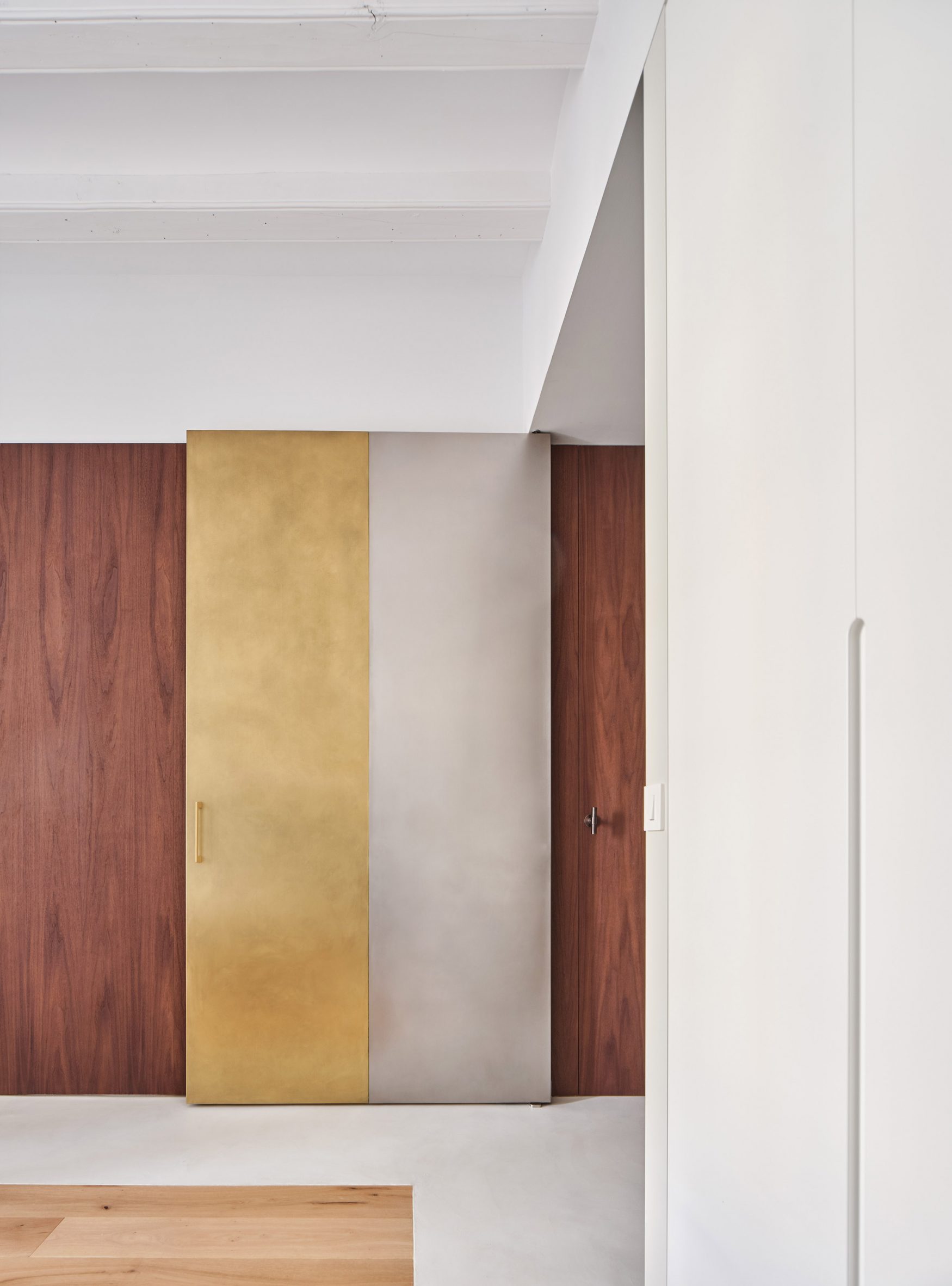 Un long mur lambrissé de noyer traverse les espaces de vie d’un blanc éclatant de cet appartement située dans la capitale catalane, rénové par le studio local Raúl Sanchez Architects.