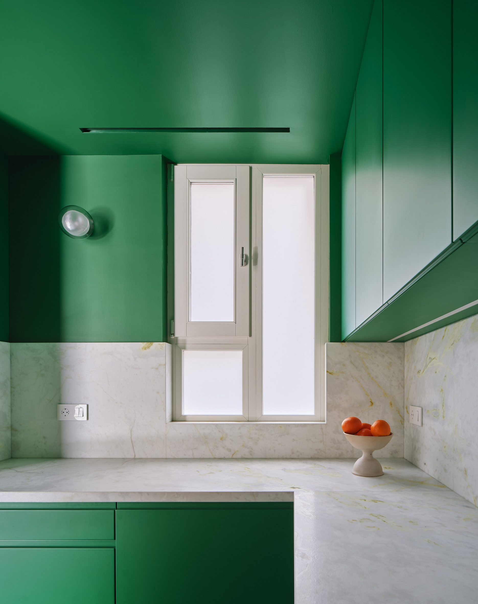 L’une d’elles est précédée d’une imposante porte pivotante qui, à l’instar de l’appartement, est divisée en deux parties. L’une est revêtue d’acier inoxydable, l’autre de laiton. Derrière un long mur en noyer se dissimulent d’autres pièces, chacune accessible par une porte affleurante discrète. On y trouve notamment une cuisine en U, presque entièrement peinte en vert.