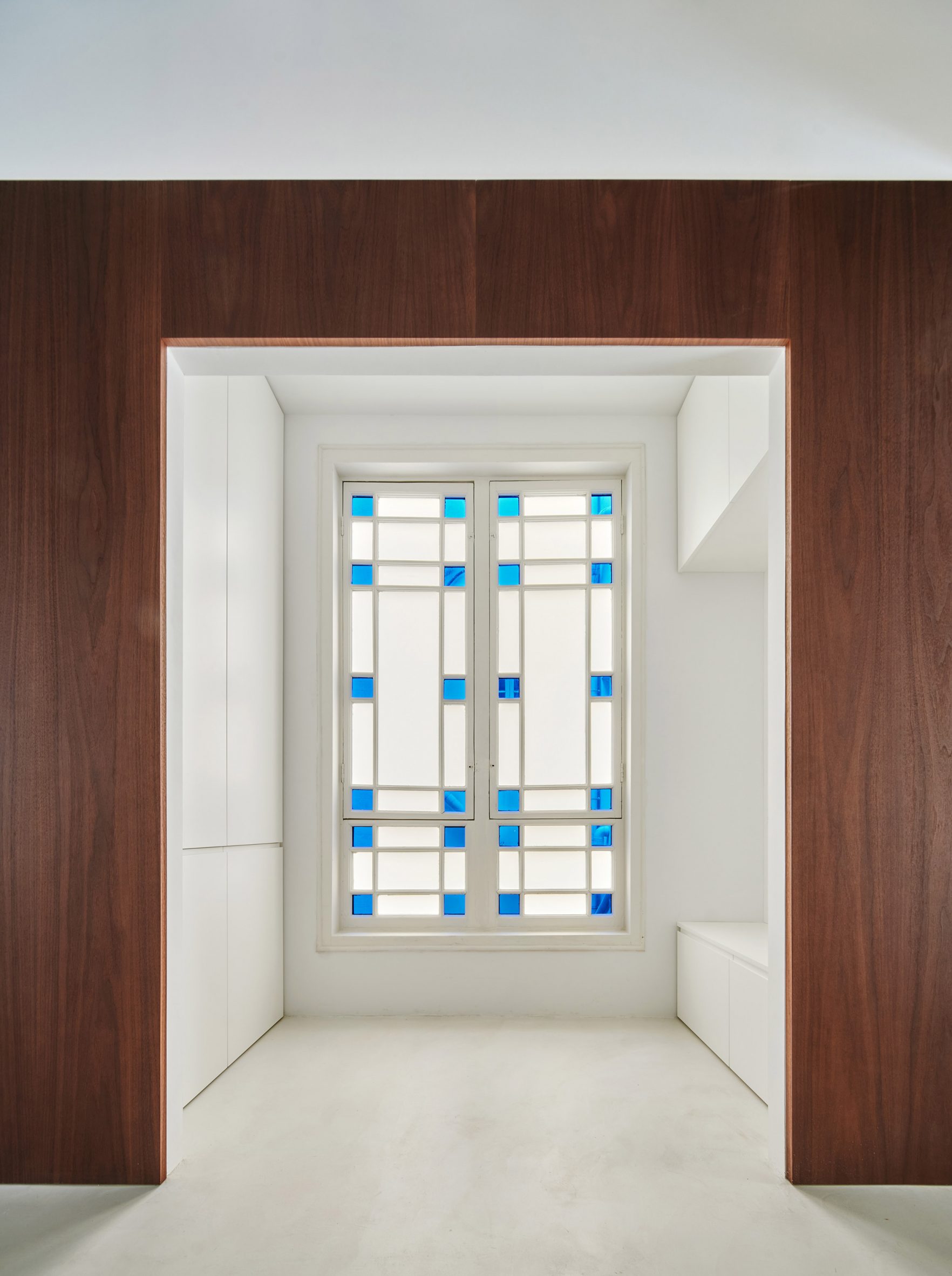 Une série de pièces longe ce mur, à commencer par la salle à manger. Ici, une partie du mur du fond est peinte en bleu foncé et intègre une banquette, tandis que le sol est recouvert en partie de carreaux hydrauliques à motifs. Plus loin dans le couloir, un coin salon a été aménagé devant deux vitraux. Viennent ensuite deux chambres partiellement peintes en bleu, assorties à la salle à manger.