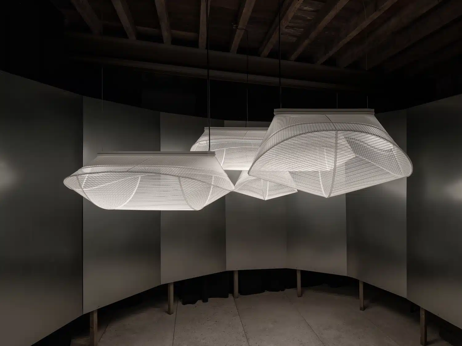 Dès le premier regard, les suspensions LightMass^ évoquent des volumes dessinés à main levée dans les airs. Le maillage translucide, presque diaphane, capte l’attention, le regard. Éteints, les luminaires ressemblent à des esquisses flottantes ; allumés, ils se métamorphosent en éléments lumineux, définissant les contours d’un espace avec douceur.