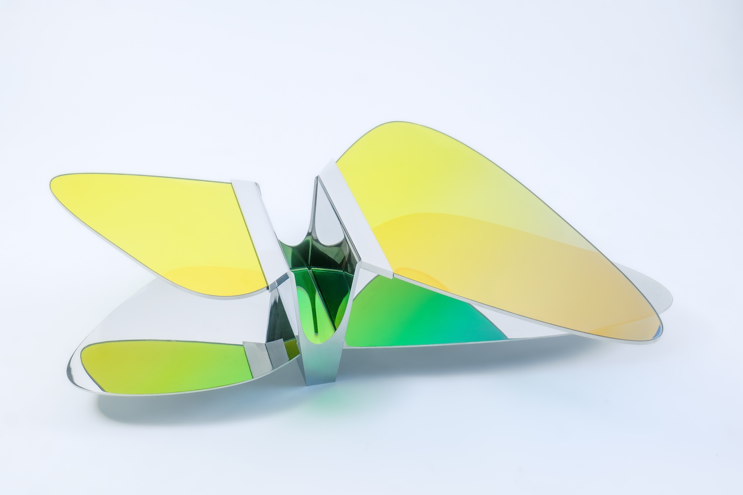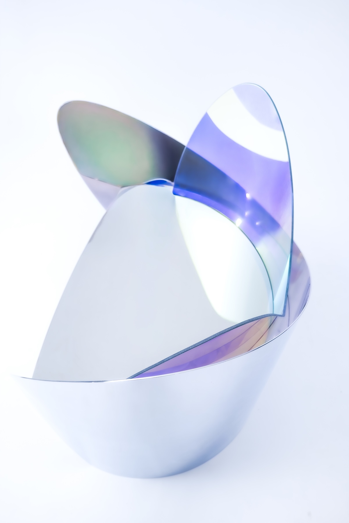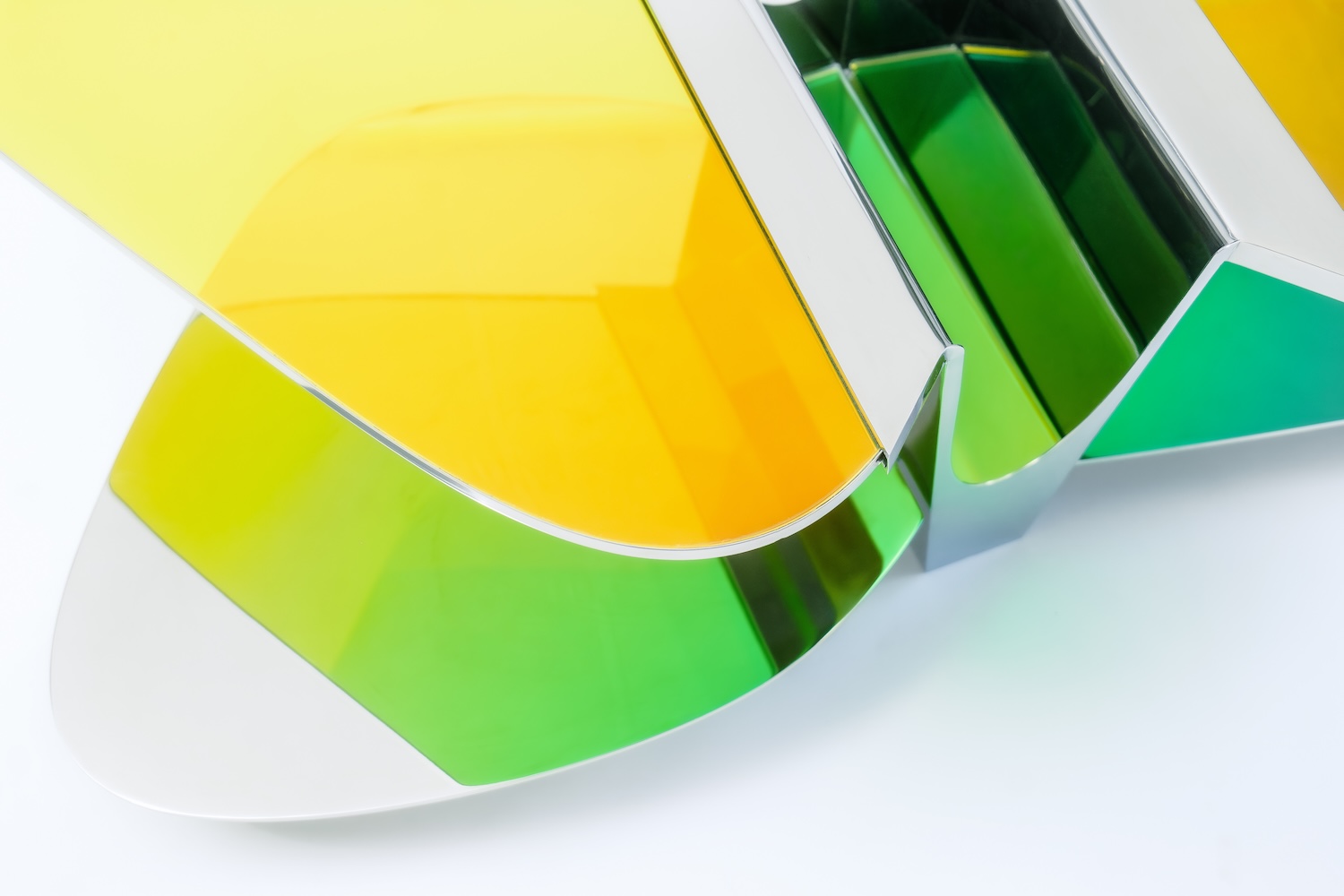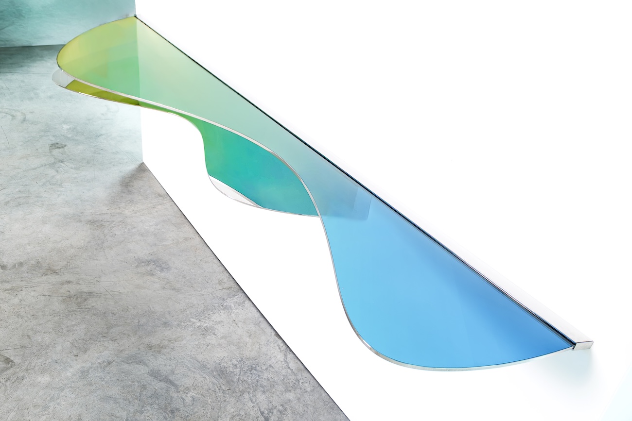 Avec la collection ODA LIK Variations, la créatrice franchit un nouveau seuil dans sa recherche. Ces pièces, réalisées en verre dichroïque et acier poli-miroir, semblent respirer sous la lumière. Selon l’angle, l’intensité ou la teinte du jour, elles changent de peau, se métamorphosent, offrant un spectacle mouvant de transparences et de reflets.