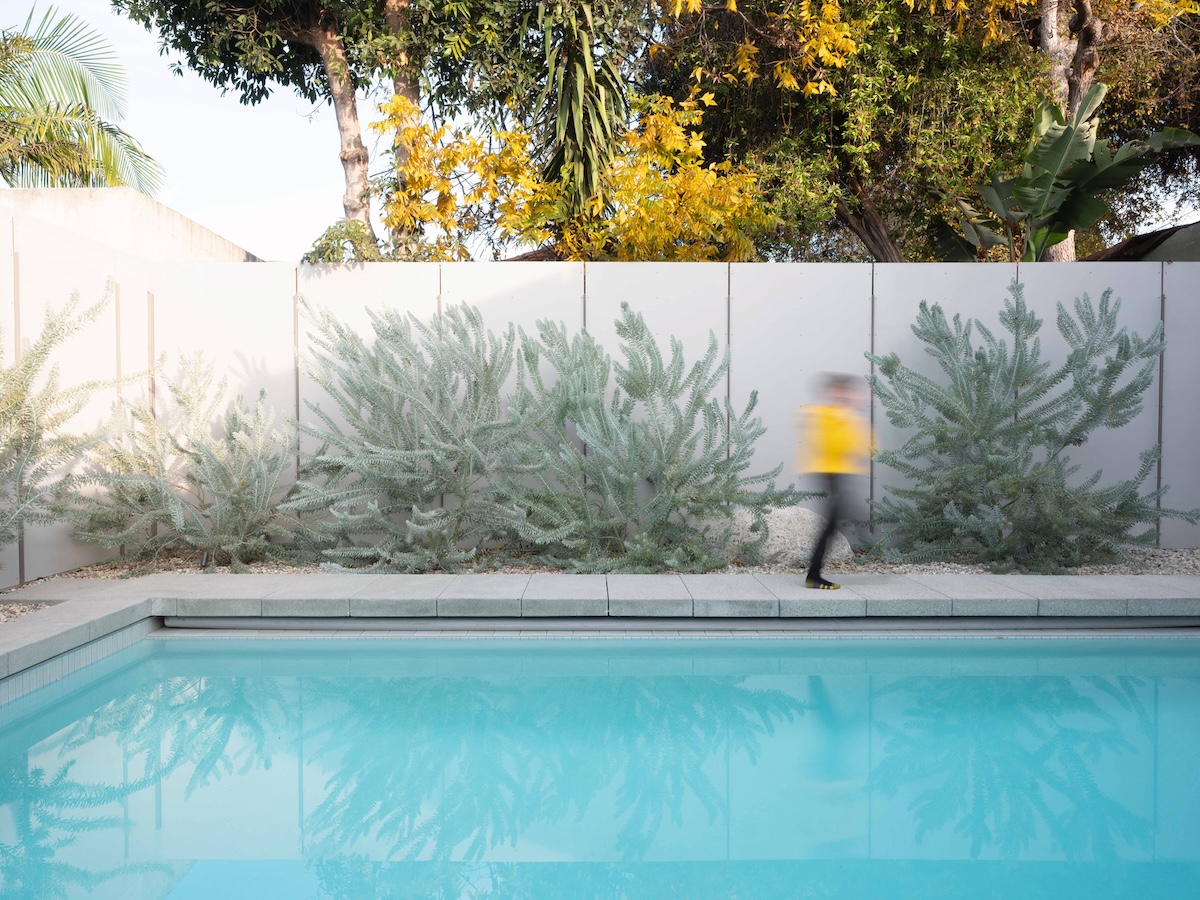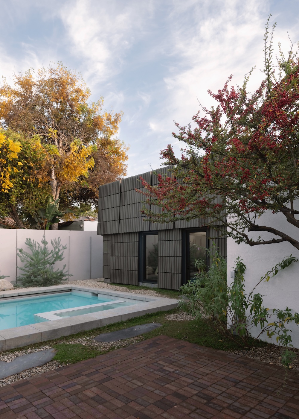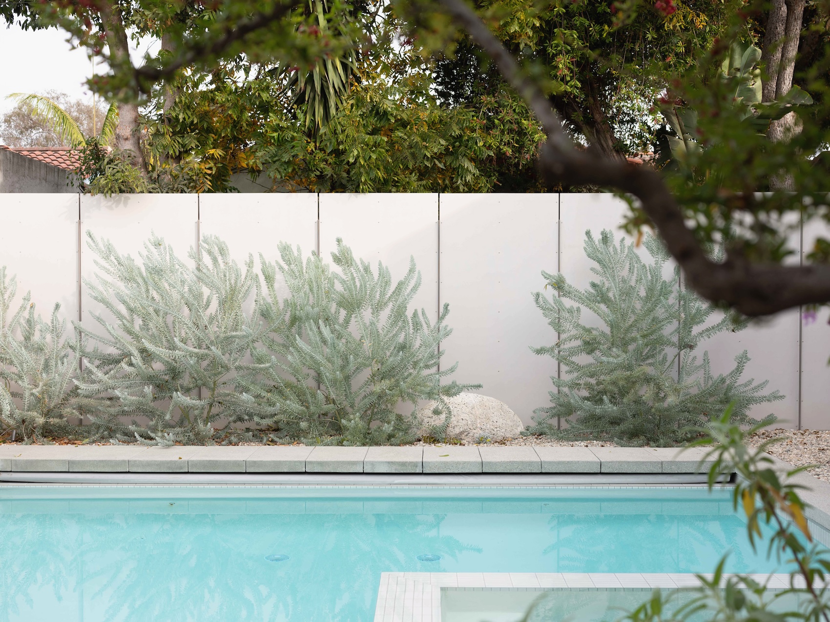 Pour l’aménagement paysager, l’équipe d’architectes a collaboré avec Phil Davis, un partenaire de longue date, afin de concevoir une palette de plantes indigènes de Californie. Du point de vue de l’aménagement du site, le jardin est pensé comme une pièce à ciel ouvert, délimitée par un mur d’enceinte sur mesure et une vaste terrasse que les architectes comparent à un « tapis de briques ». Le rebord surélevé de la piscine est suffisamment large pour s’y détendre et crée une bordure nette contre laquelle un massif de gravier et de plantes indigènes duveteuses peut s’épanouir librement.