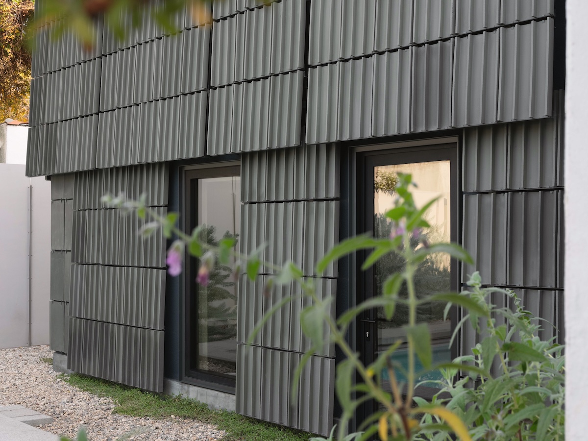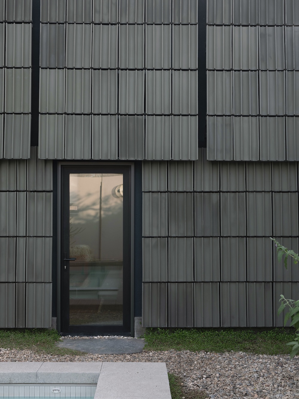 Plutôt que de sceller les grandes tuiles à l’extérieur, ils ont conçu une structure en aluminium à deux couches sur laquelle elles reposent comme une étagère, donnant ainsi aux unités une apparence brute, comme un grand empilement de matériaux. Le jeu d’ombres sur les tuiles vertes profondément rainurées évoque les qualités paysagères de texture, de tonalité, de profondeur visuelle et de sérénité.