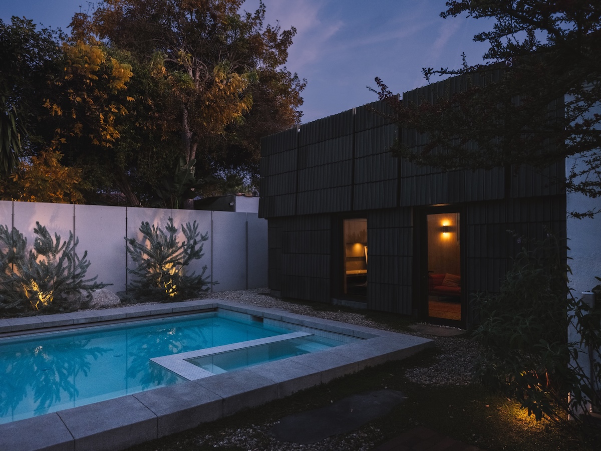 En revanche, l’agencement du garage et de l’allée, qui morcellent le jardin, le rend plus adapté au stationnement qu’à la vie quotidienne et aux réceptions. La première étape a consisté à inverser la disposition du jardin et de la structure du bâtiment en construisant une dépendance à l’angle du fond du terrain afin de dégager suffisamment d’espace pour aménager une piscine et une grande terrasse.