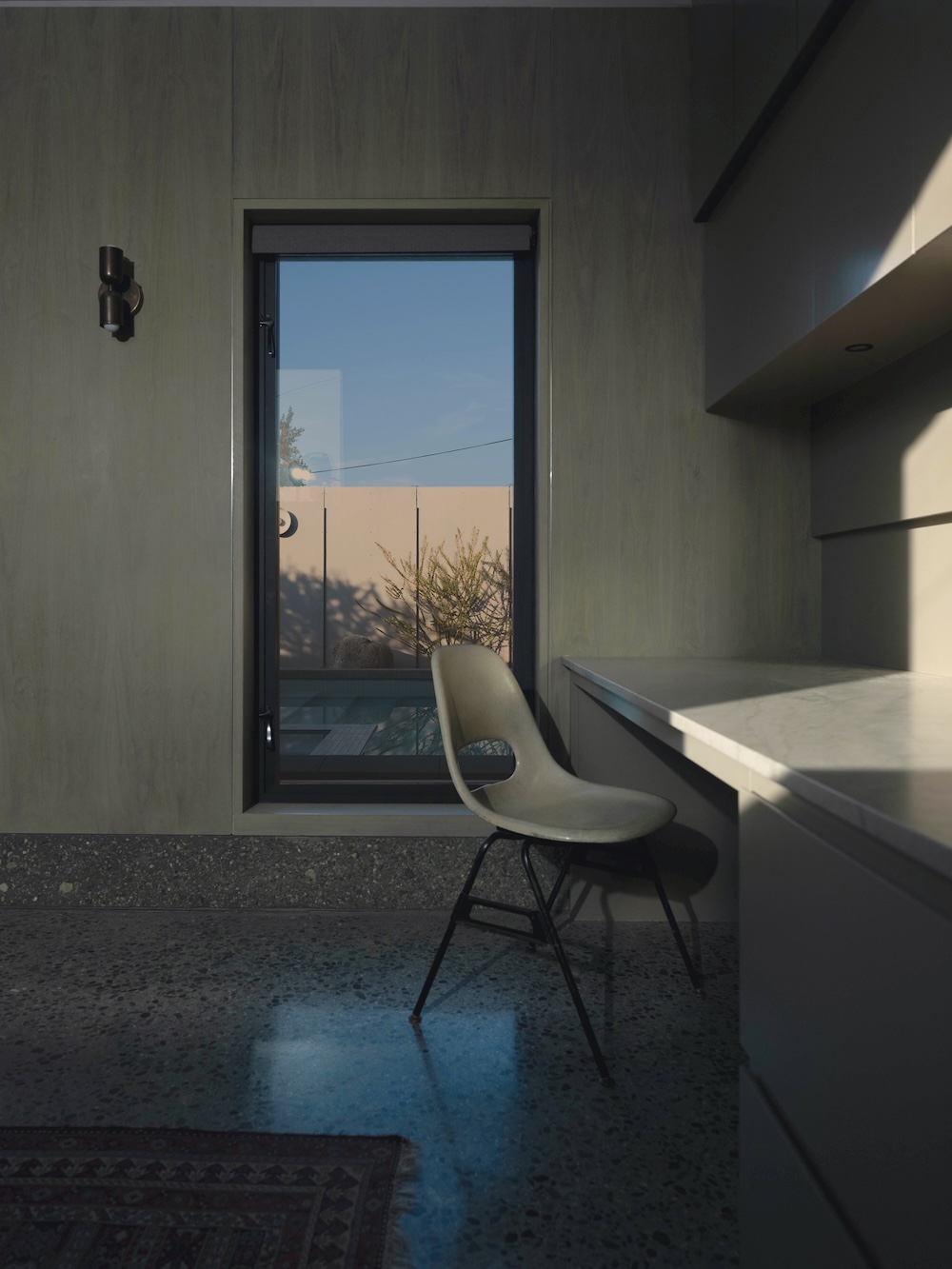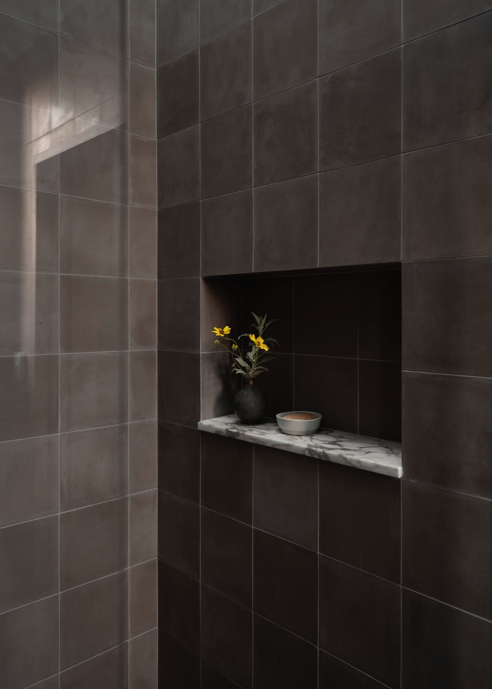 Afin de mettre en œuvre certains détails sur-mesure, les architectes ont fabriqué eux-mêmes une sélection de composants, notamment la plinthe en granulats, les panneaux muraux en noyer et les encadrements de fenêtres. Les boiseries sont traitées avec une huile pour bois danoise pigmentée de la marque Linolie, choisie pour sa capacité à créer un effet de couleur subtil. Une huile verte appliquée sur la chaleur du noyer crée une finition vert argenté aux reflets violets. Cette qualité a guidé le choix de la palette délicate des meubles, de la pierre et des carreaux dans tout l’intérieur.