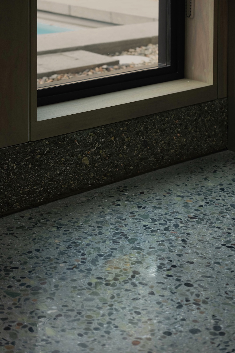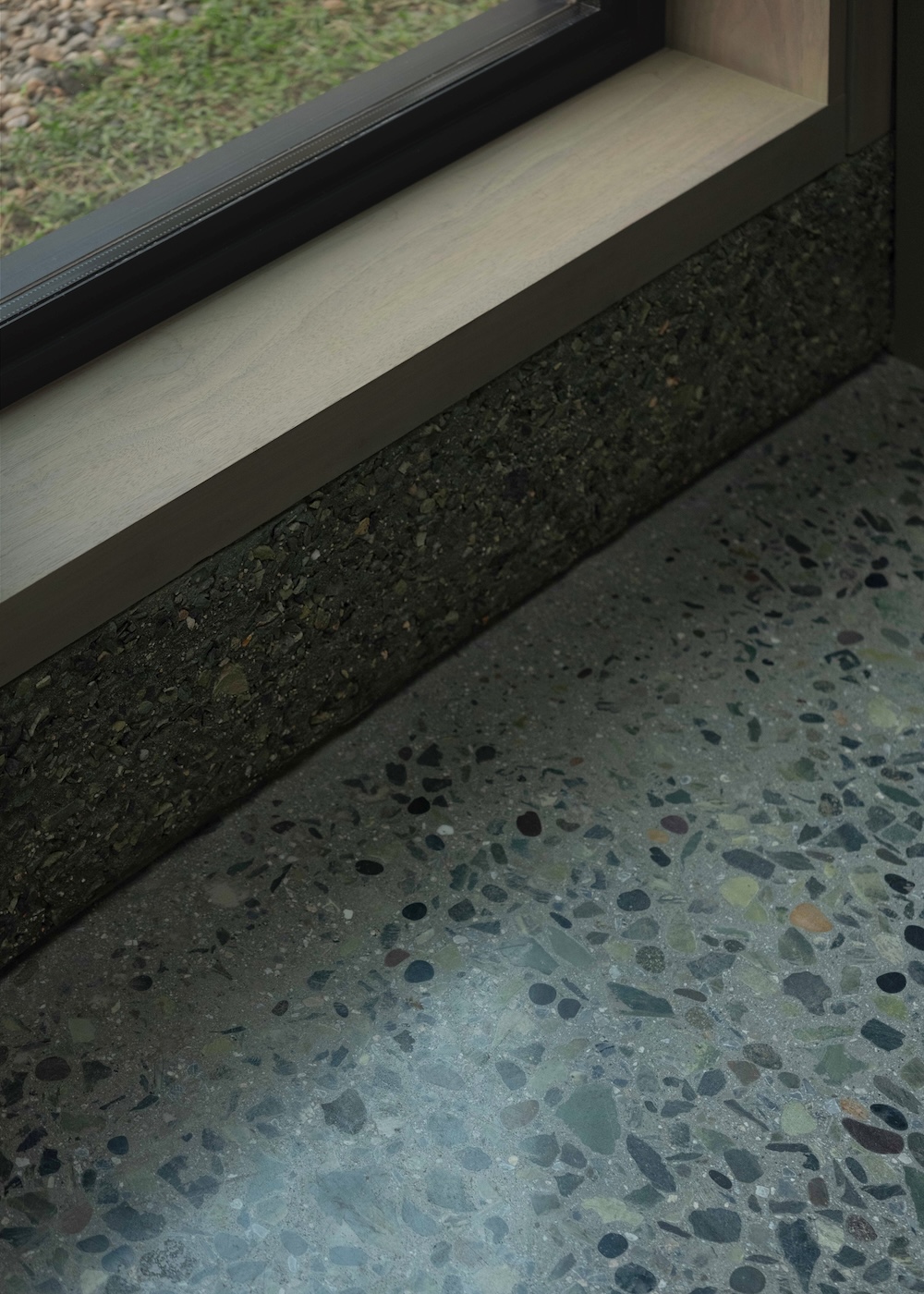 L’intérieur sert également de terrain d’expérimentation pour les matériaux, à commencer par la conception d’un sol en béton composé d’une teinte verte et de gros granulats de pierre. Ce sol, équipé d’un chauffage radiant, est poli, tandis que la plinthe est laissée brute avec une finition en granulats apparents. Pendant la construction, l’équipe de conception a travaillé en étroite collaboration avec l’entrepreneur pour réaliser le bâtiment de base.