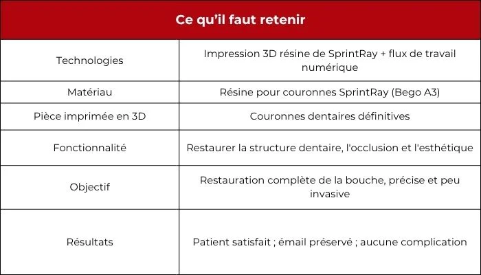 Alors que la résine composite est traditionnellement préférée pour les cas d’usure dentaire, car elle peut être facilement réparée et nécessite une préparation minimale de la dent, les couronnes imprimées en 3D offraient plusieurs avantages clés dans ce cas. Cette technologie a permis d’obtenir une précision exceptionnelle, une adaptation marginale juste (ajustement parfait entre la couronne et le bord de la dent) et une résistance structurelle améliorée. Le flux de travail numérique a permis de s’assurer que chaque couronne correspondait au modèle d’essai approuvé, offrant des résultats fonctionnels et esthétiques prévisibles tout en préservant autant que possible la structure naturelle de la dent.