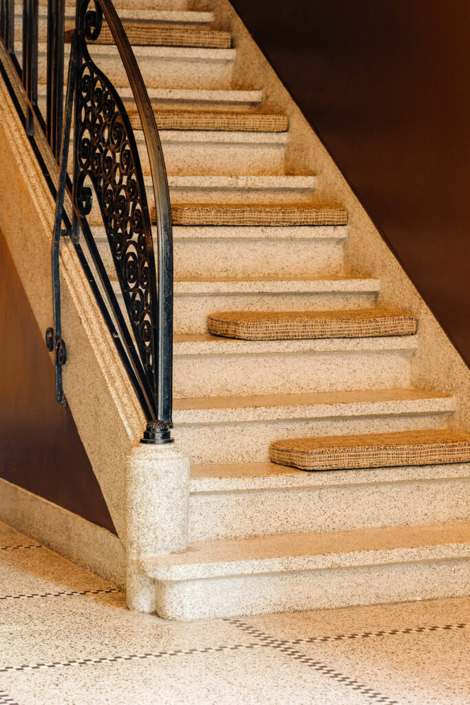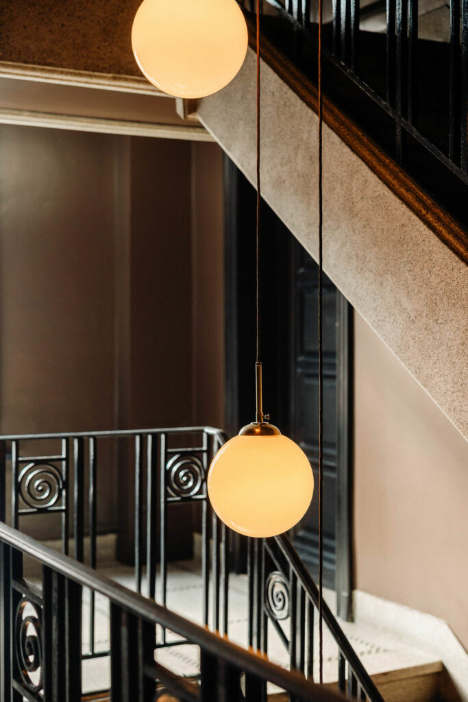 Ici, les tons bruns profonds remplacent les jaunes beurrés du premier établissement, et un escalier sculptural se dresse comme pièce maîtresse, donnant au lieu son caractère distinctif.