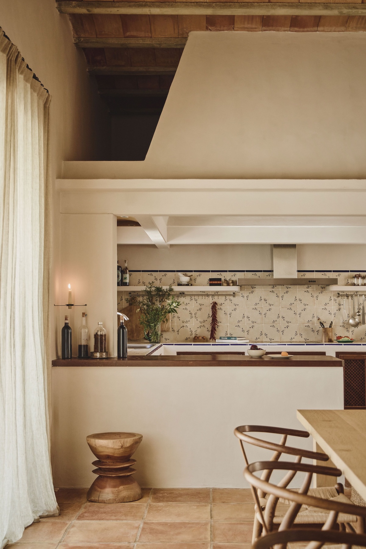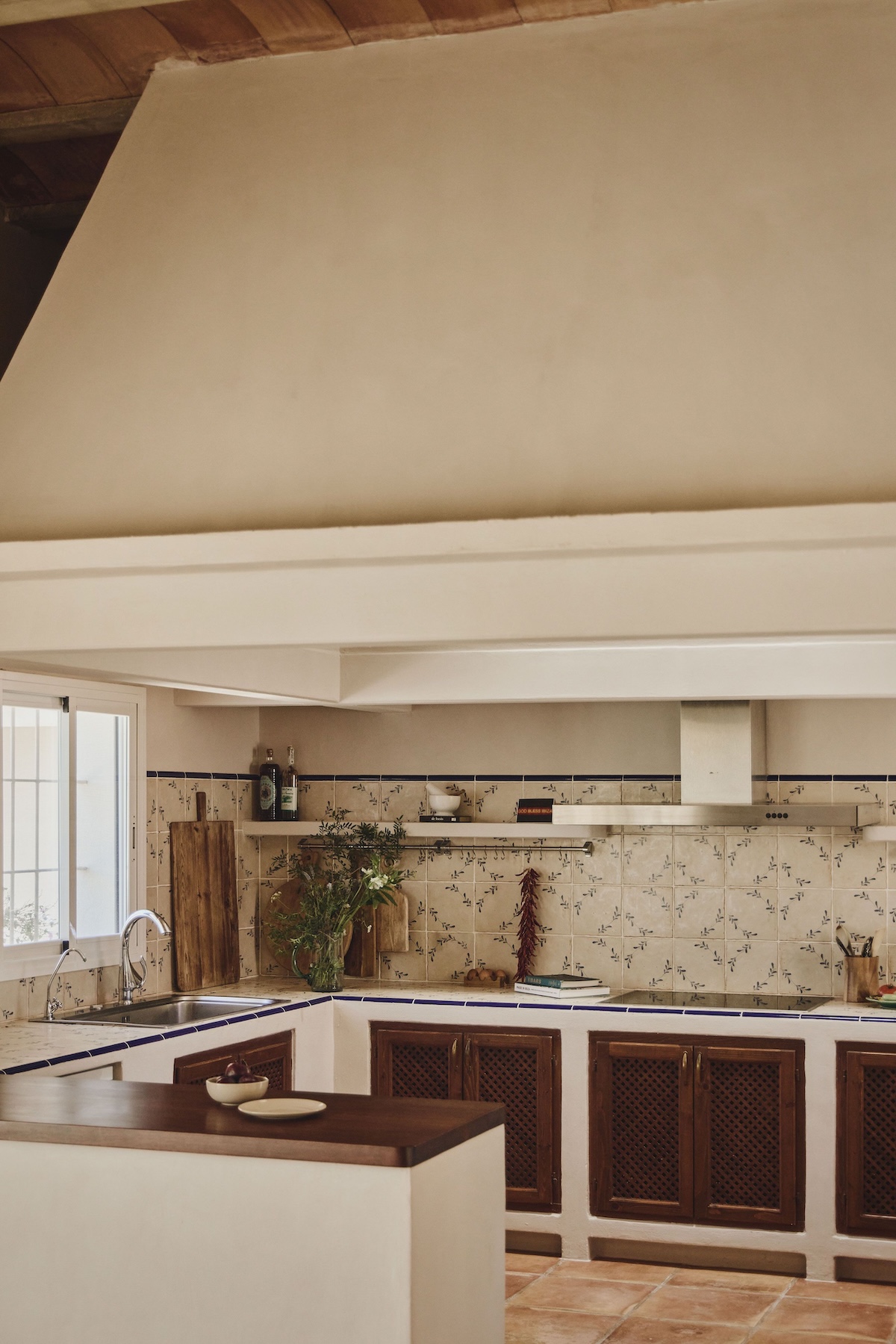 Dans la cuisine, des carreaux traditionnels peints à la main habillent les murs, mêlant nostalgie rustique et clarté contemporaine.