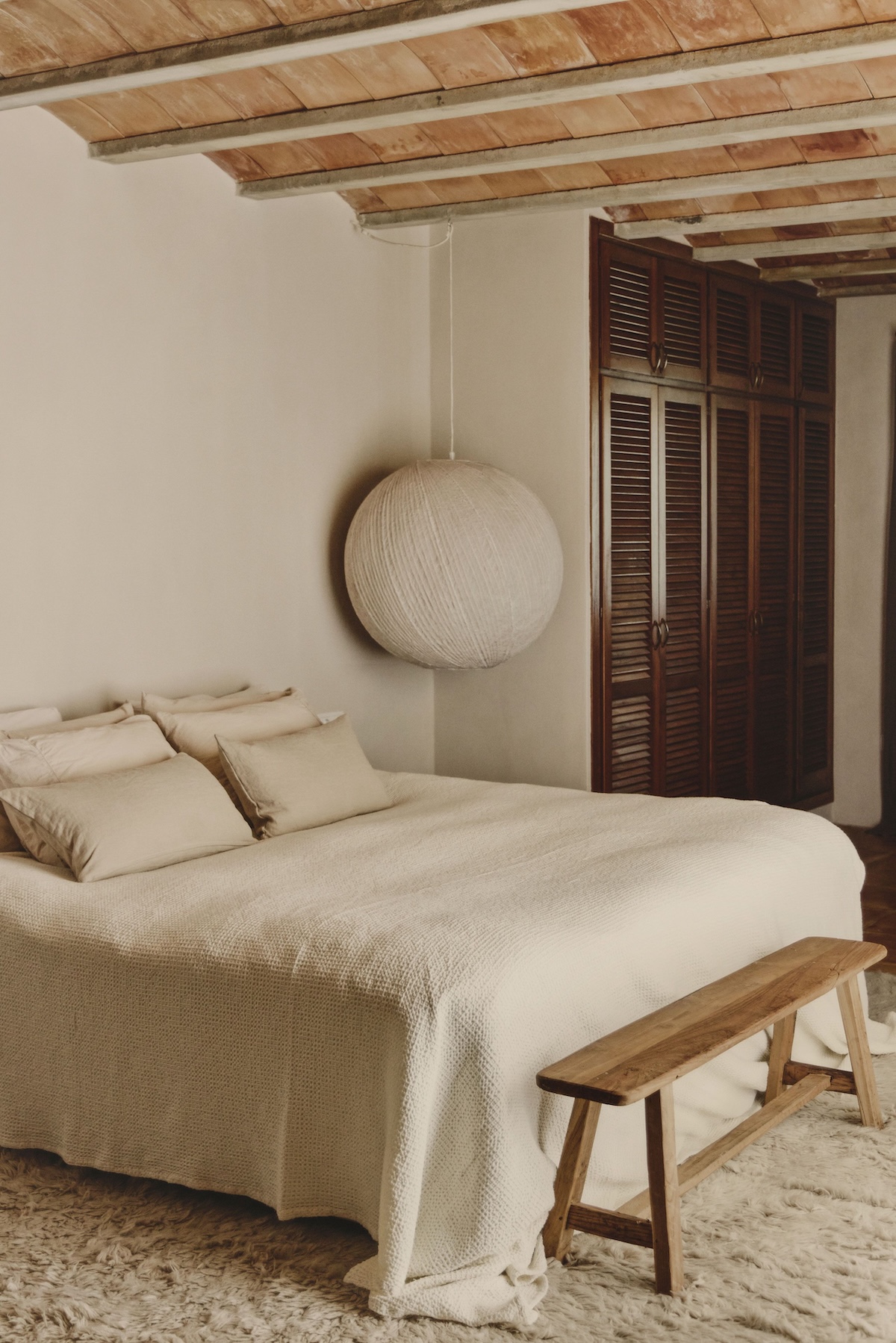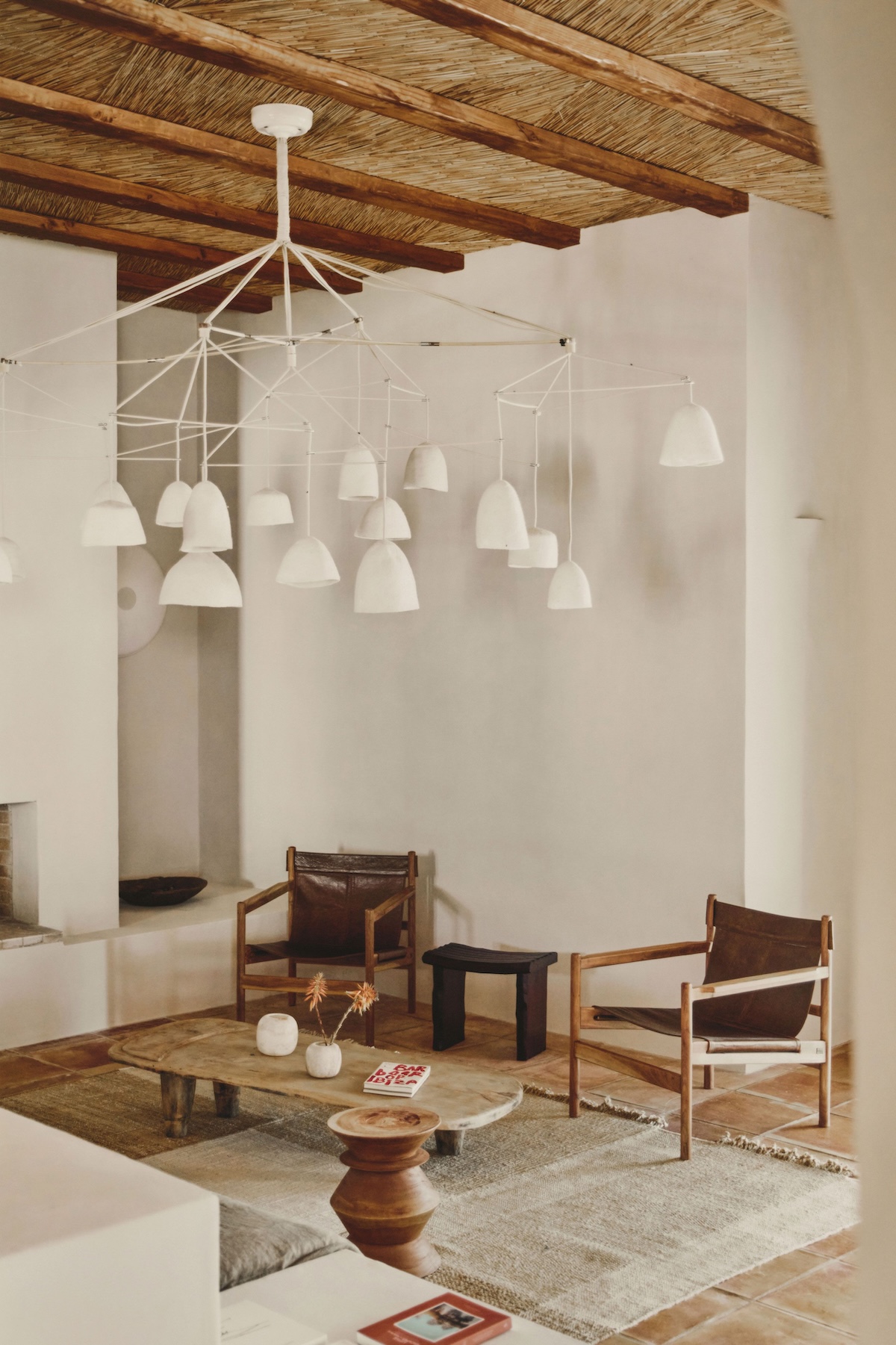 Des suspensions en feutre, de tailles variées et disposées en une constellation aérienne, apportent une douceur sculpturale au salon, tandis que des tables en bois réalisées à la main et des tissus d’ameublement en lin font écho à la sobriété naturelle de la maison.