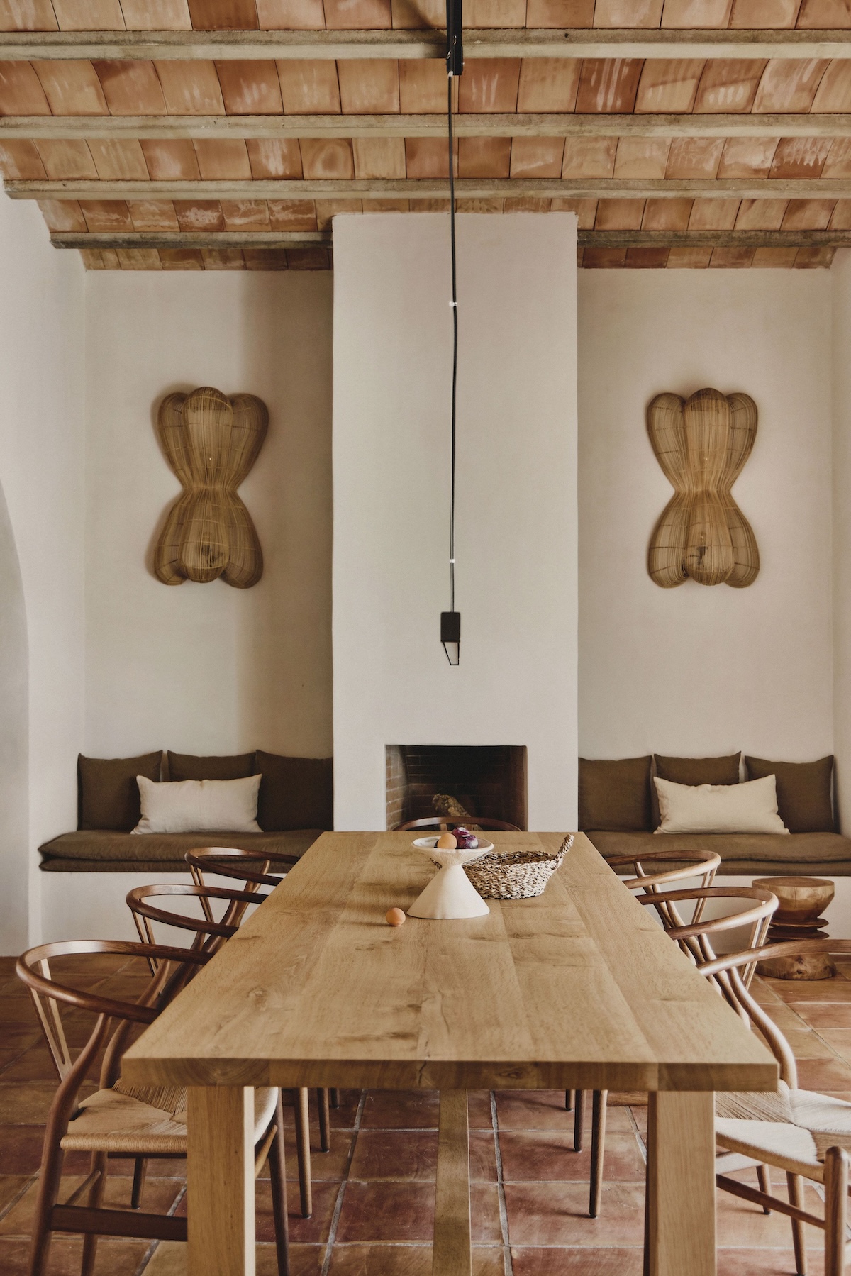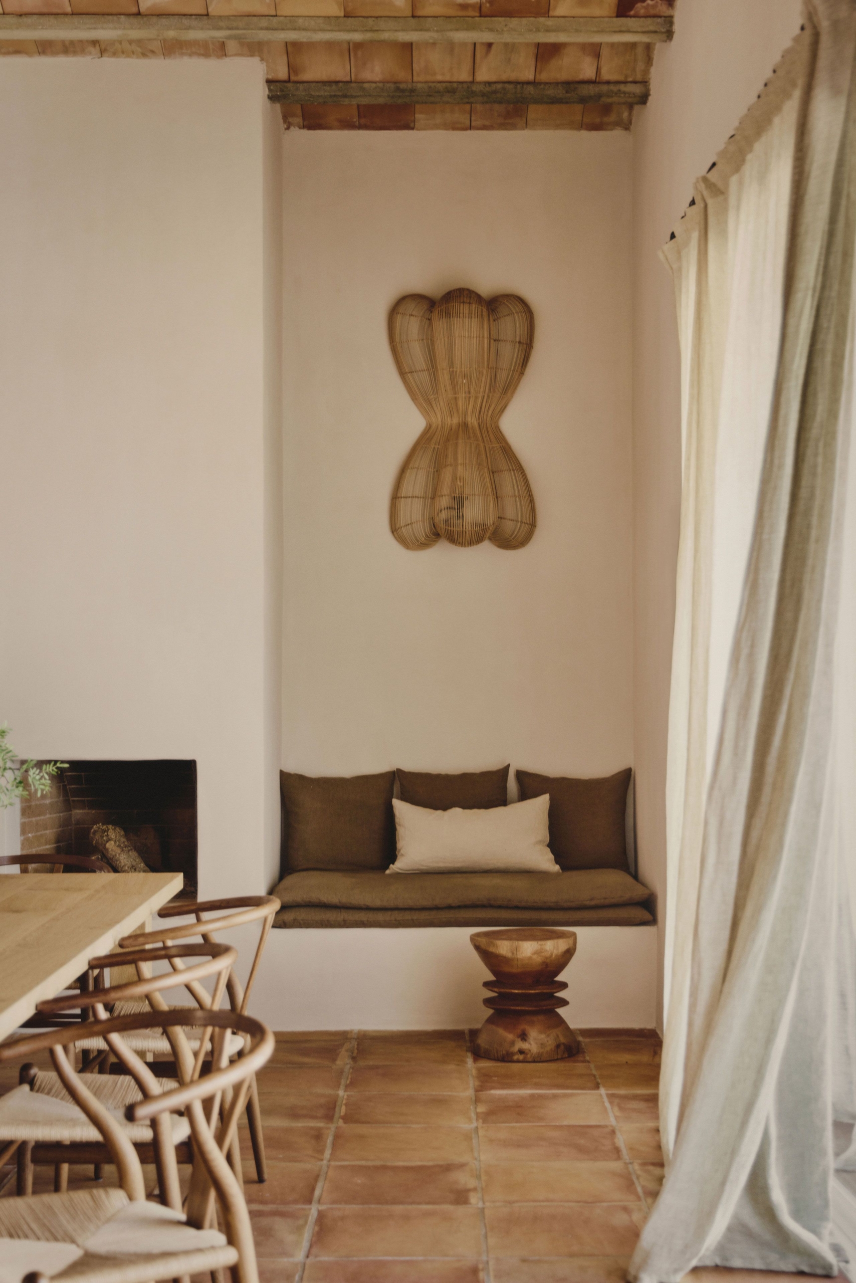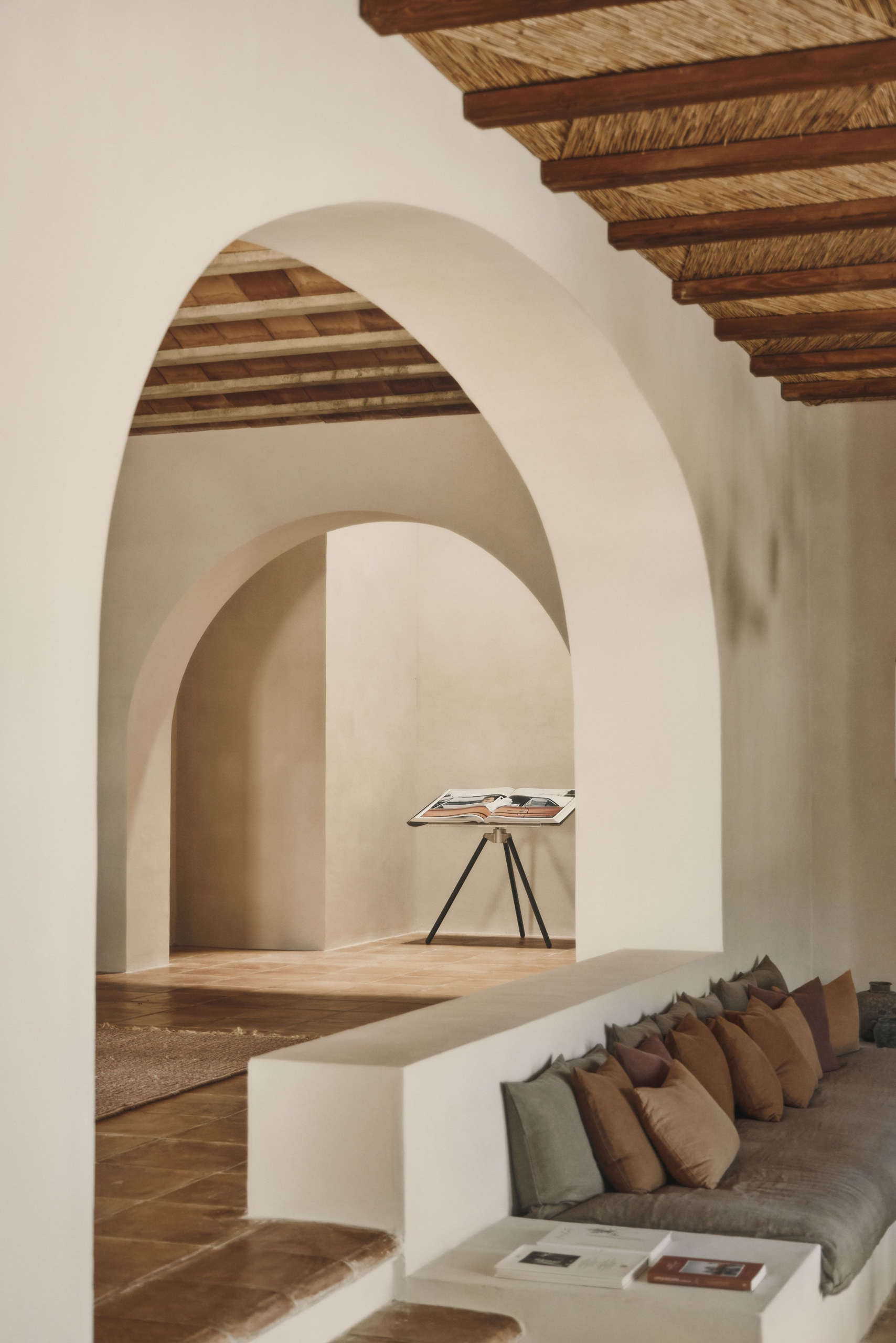 Le studio a collaboré étroitement avec des artisans locaux, apportant une dimension artisanale aux éléments clés du projet. L’un des détails les plus remarquables est le plafond en poutres de canne tressée du salon, spécialement conçu pour élever l’espace. Attirant le regard vers le haut, il introduit une chaleur artisanale et une profondeur texturée, insufflant à la pièce un rythme doux qui fait écho aux voûtes du plafond de la salle à manger attenante.