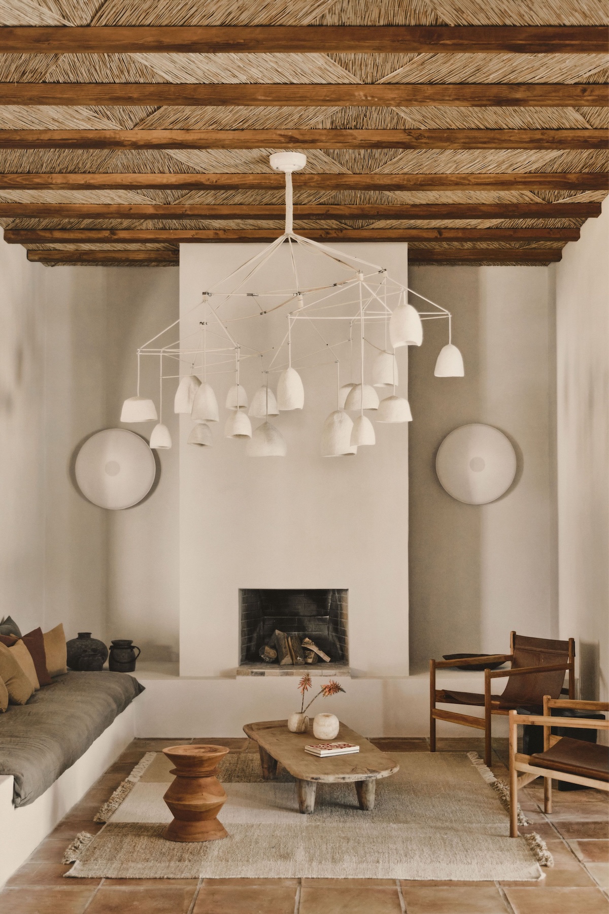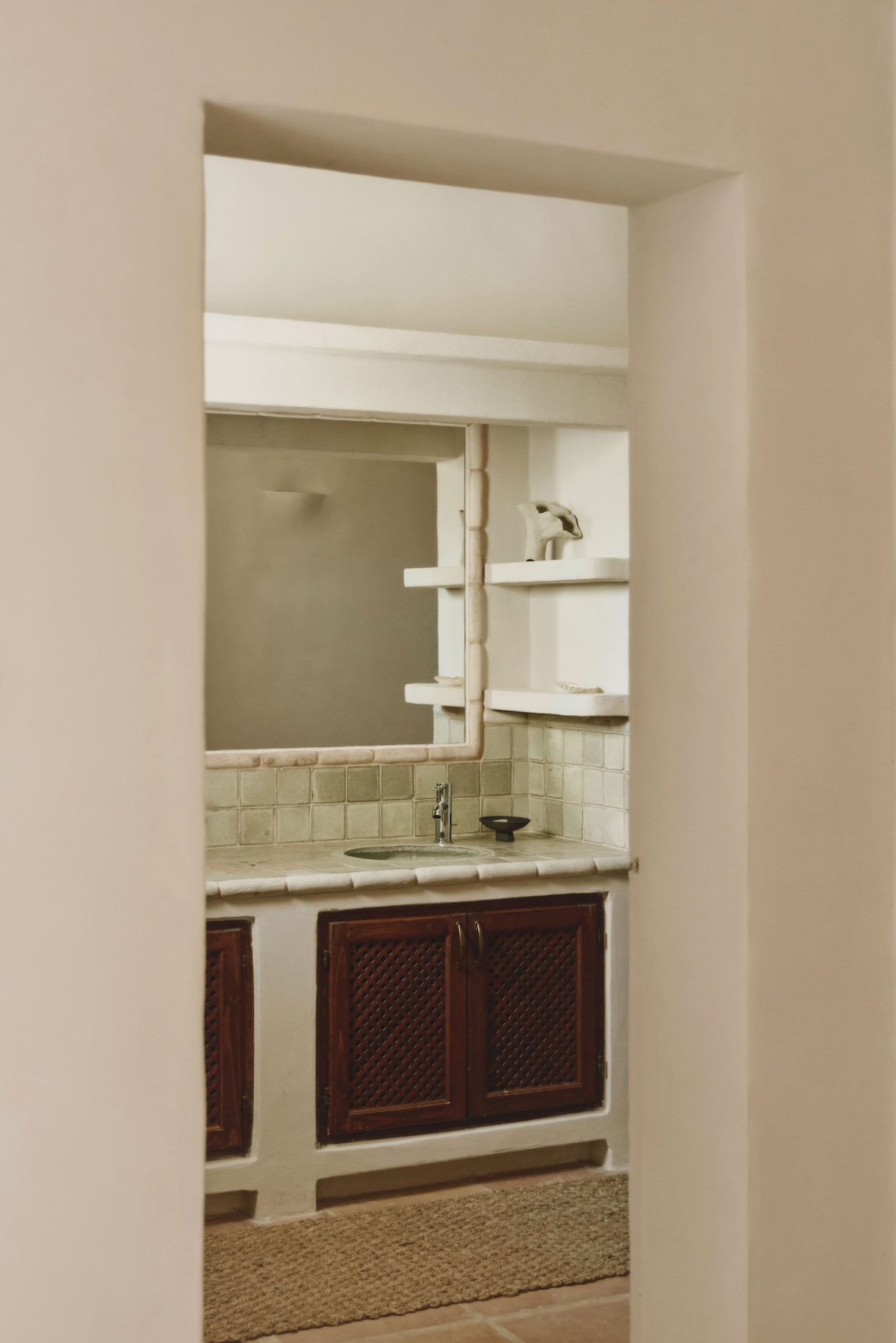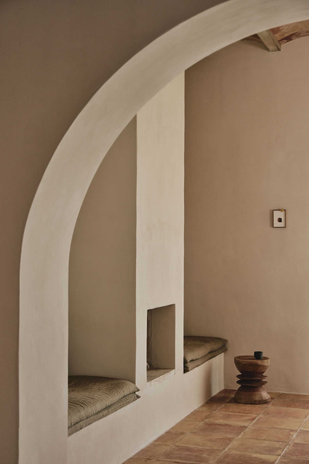 Le studio a collaboré étroitement avec des artisans locaux, apportant une dimension artisanale aux éléments clés du projet. L’un des détails les plus remarquables est le plafond en poutres de canne tressée du salon, spécialement conçu pour élever l’espace. Attirant le regard vers le haut, il introduit une chaleur artisanale et une profondeur texturée, insufflant à la pièce un rythme doux qui fait écho aux voûtes du plafond de la salle à manger attenante.