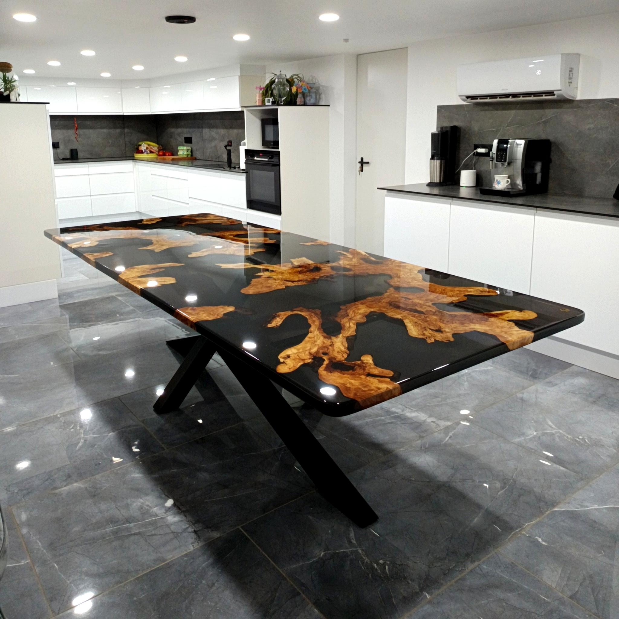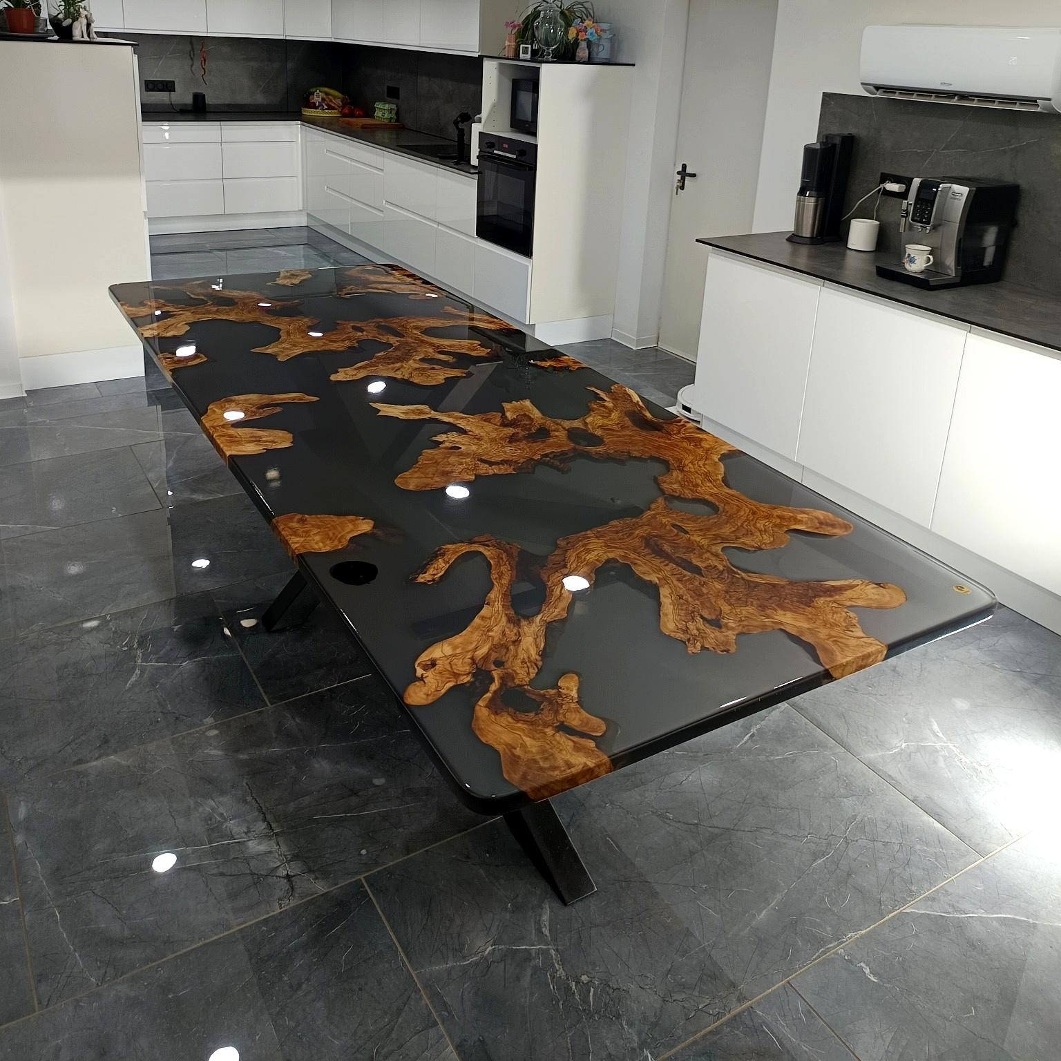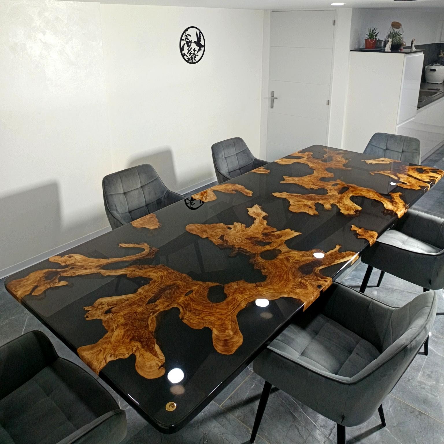 L’alliance du bois d’olivier et de la résine époxy écologique est au cœur de l’identité de la maison. Ici, la résine n’est pas un simple ajout esthétique : elle devient un langage. Transparente ou teintée, elle révèle le bois, en souligne les nœuds, les veines, les cicatrices. Elle magnifie la vie contenue dans la matière.