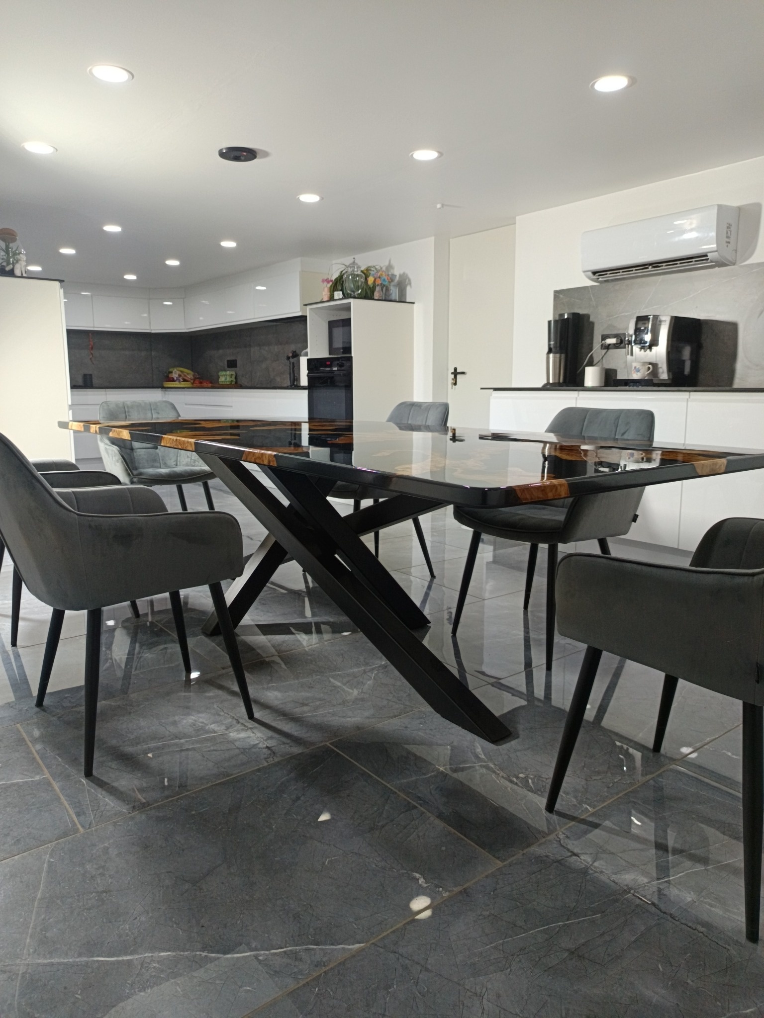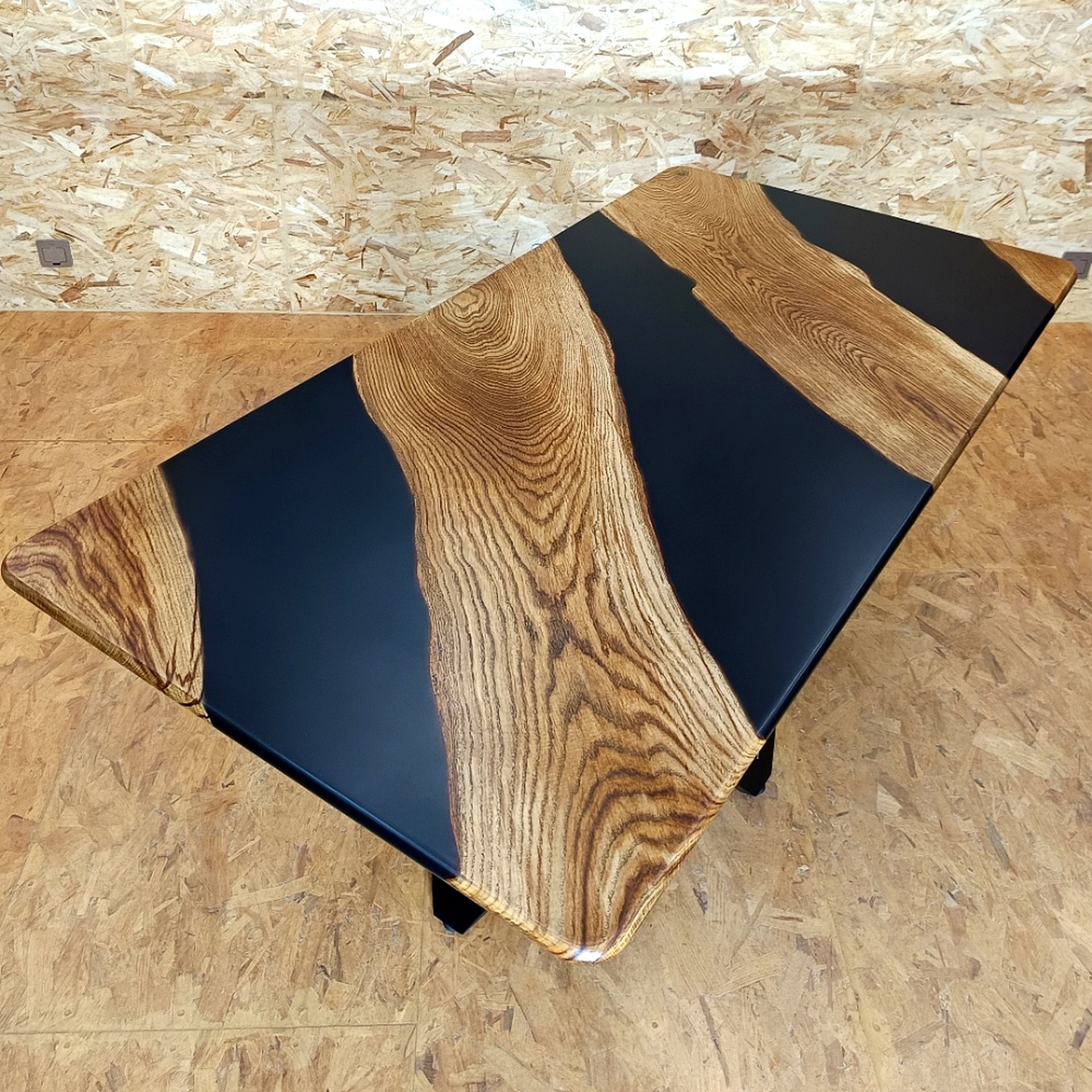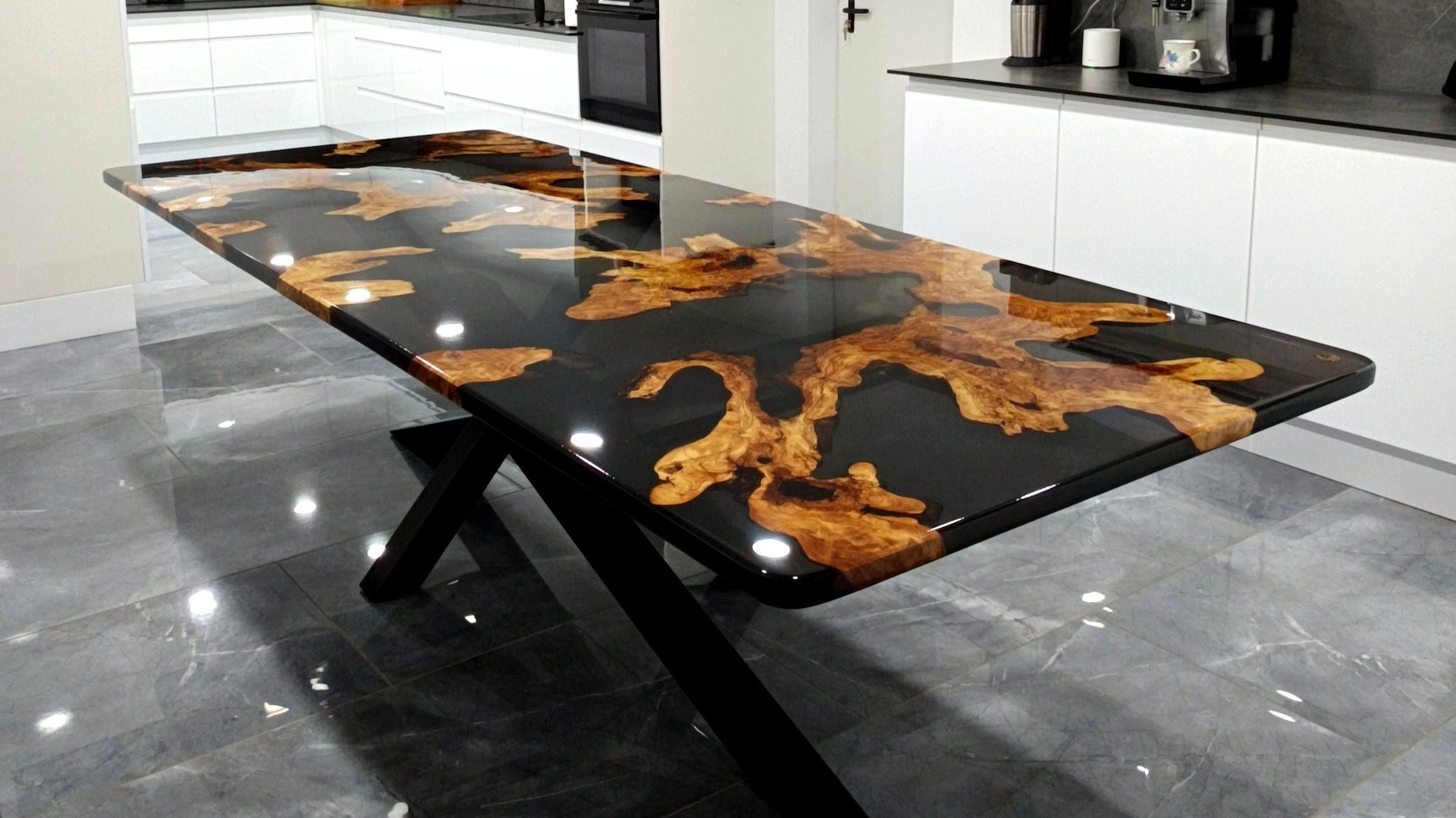 L’alliance du bois d’olivier et de la résine époxy écologique est au cœur de l’identité de la maison. Ici, la résine n’est pas un simple ajout esthétique : elle devient un langage. Transparente ou teintée, elle révèle le bois, en souligne les nœuds, les veines, les cicatrices. Elle magnifie la vie contenue dans la matière.